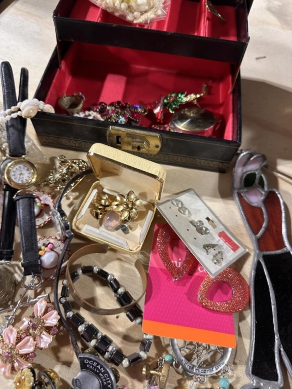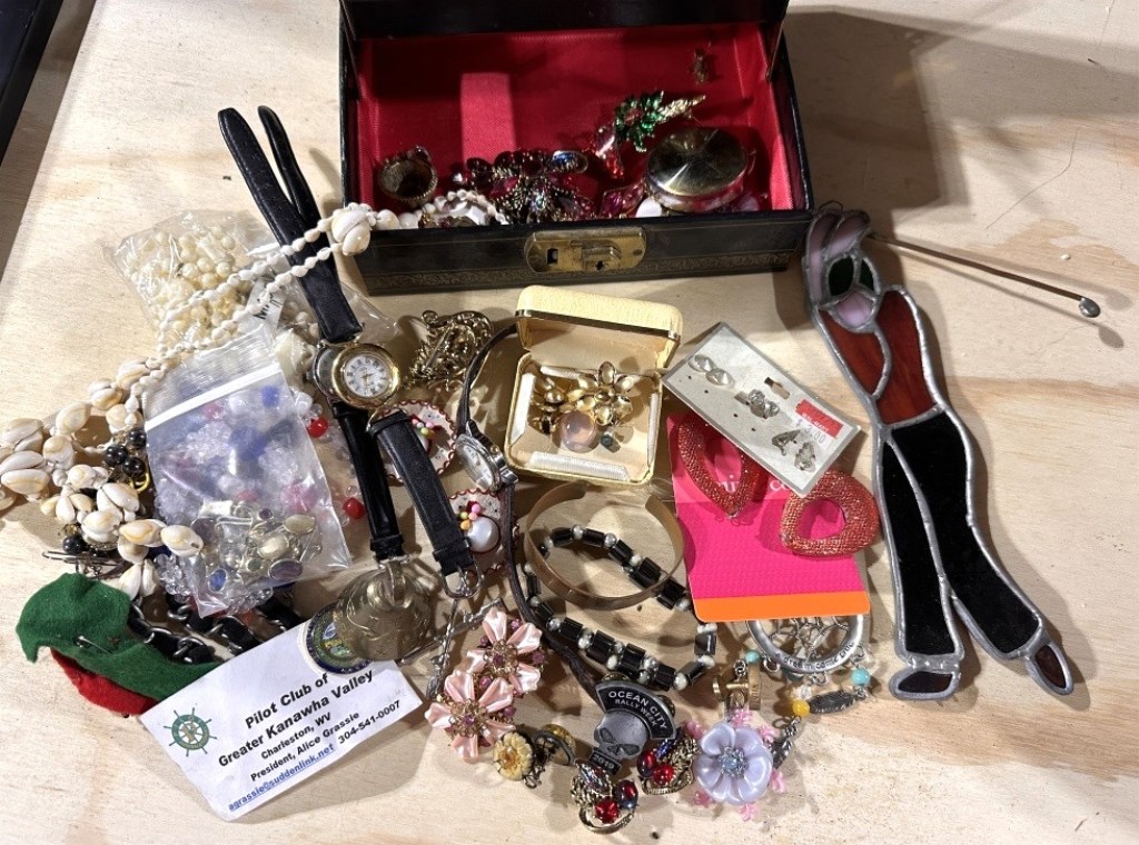 JEWELRY BOX, ASSORTMENT OF COSTUME JEWELRY, PINS, STAINED GLASS GOLFER
