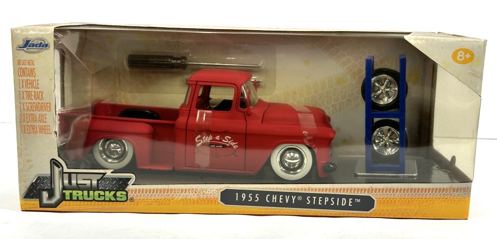NOS 1955 CHEVY STEPSIDE WITH TIRE RACK, SCREWDRIVER, 2 EXTRA AXELS, 4 EXTRA WHEELS ORIGINAL BOX