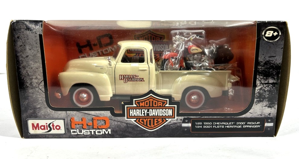 NOS 1950 CHEVROLET 3100 PICKUP 1:25 SCALE, 2001 FLSTS HERITAGE SPRINER 1:24 SCALE ORIGINAL BOX