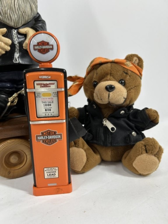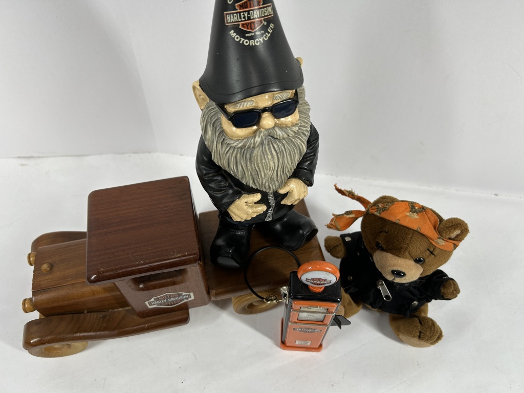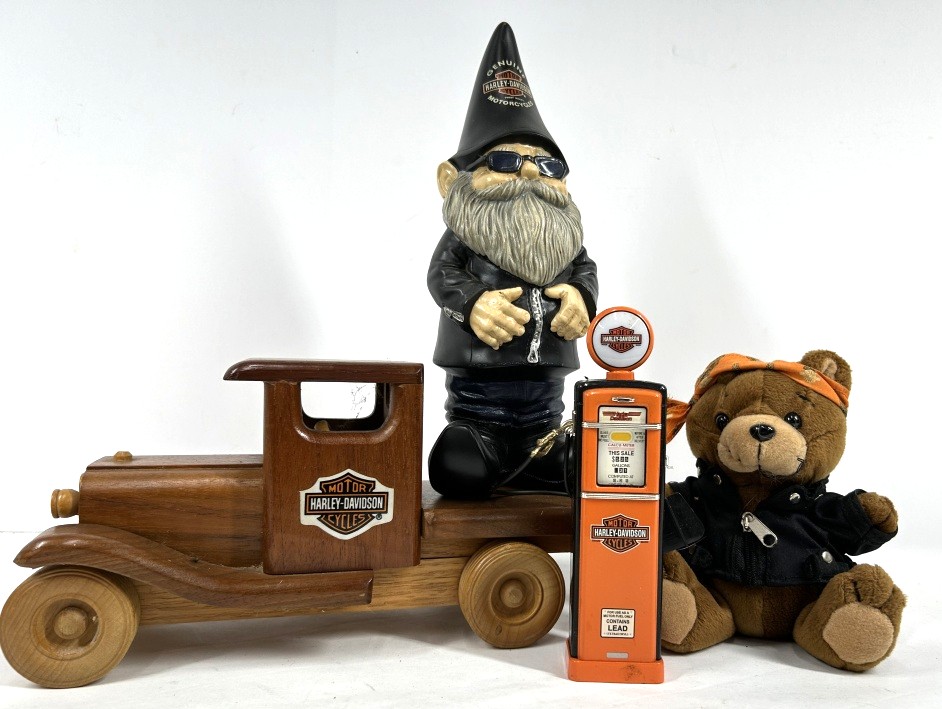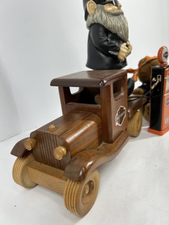 MINIATURE HARLEY-DAVIDSON GAS PUMP, WOODEN HARLEY TRUCK, BIKER BEAR AND HARLEY-GNOME