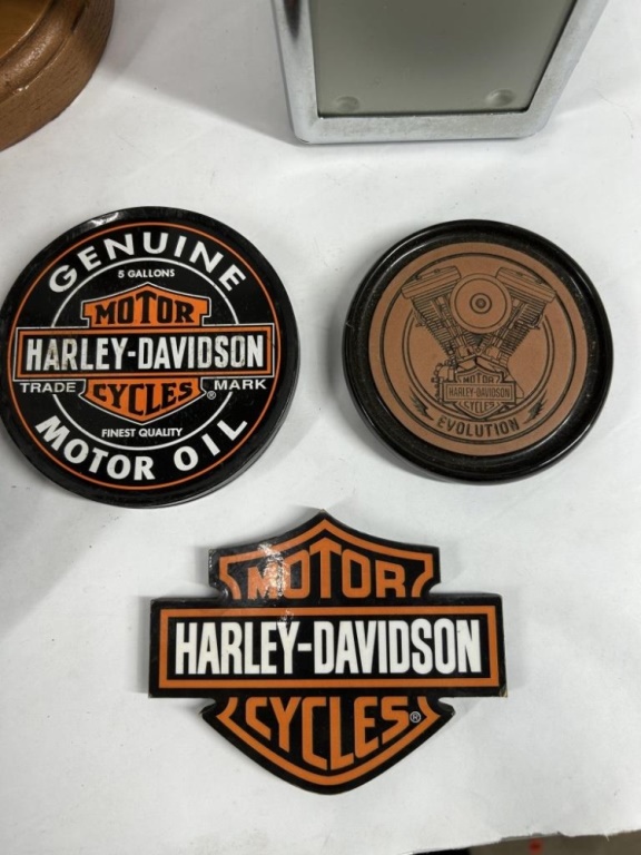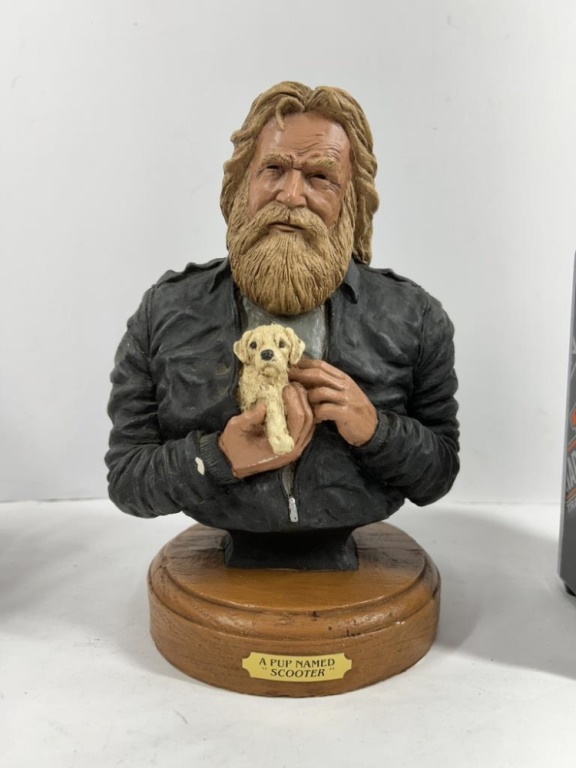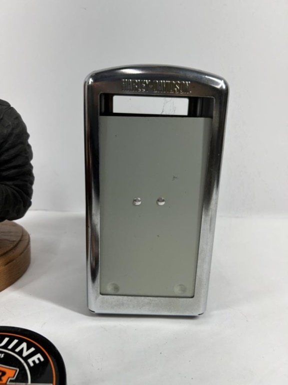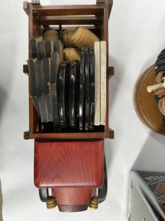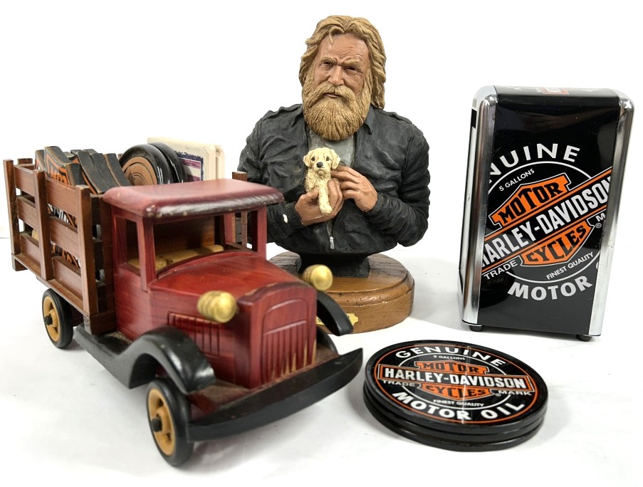 A PUP NAMED SCOOTER BRONZE SCULPTURE HARLEY-DAVIDSON NAPKIN HOLDER, COASTERS AND WOODEN TRUCK