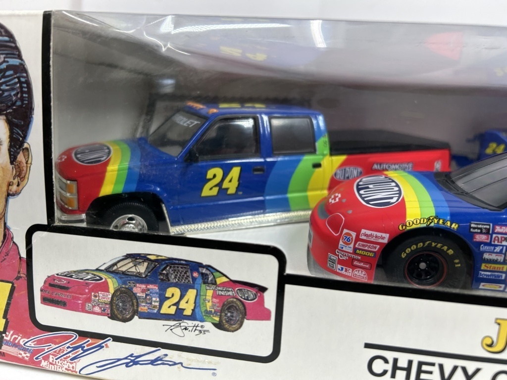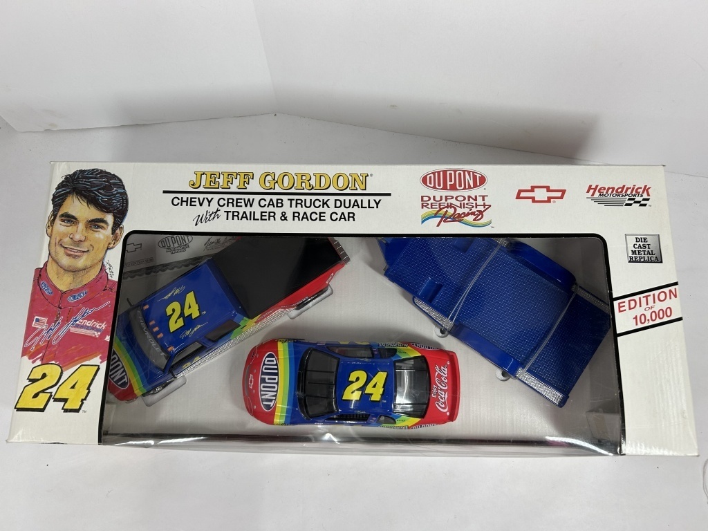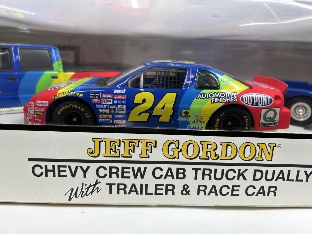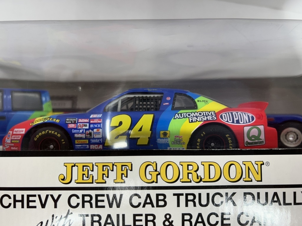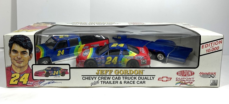 NOS JEFF GORDON TRACKSIDE COLLECTION INCLUDING CHEVY CREW CAB TRUCK DUALLY, TRAILER AND RACE CAR LIMITED EDITION OF 10,000 DIE-CAST