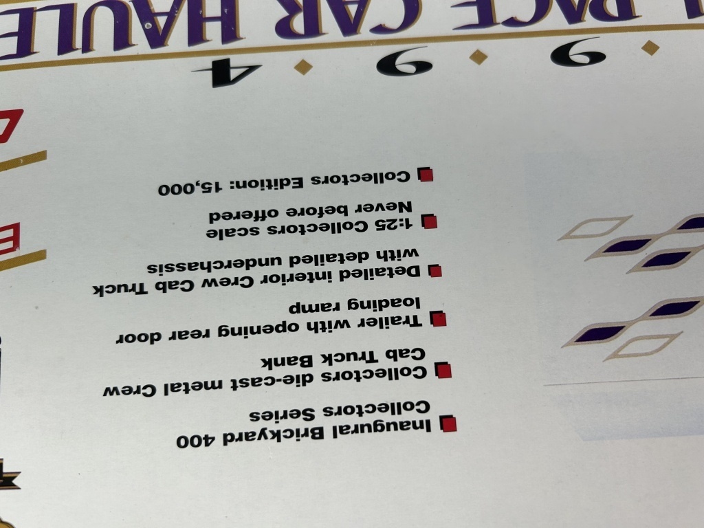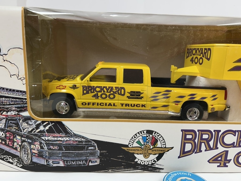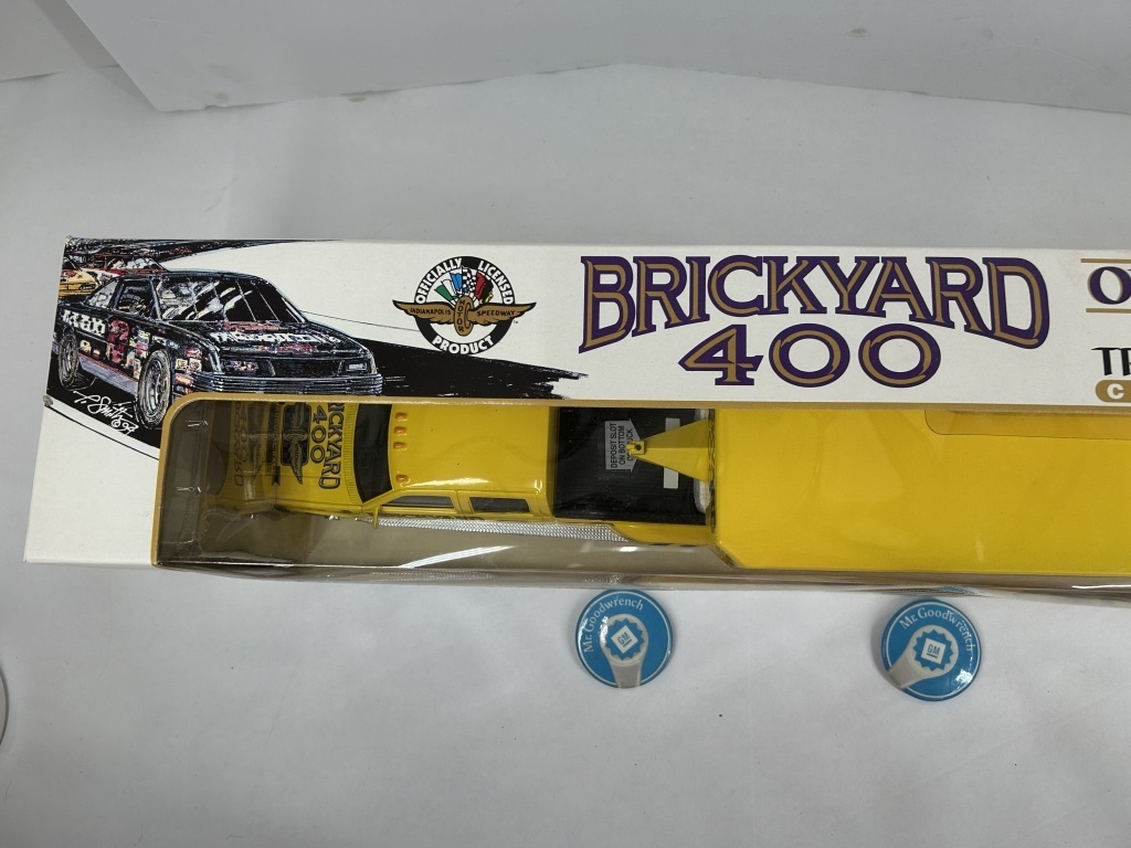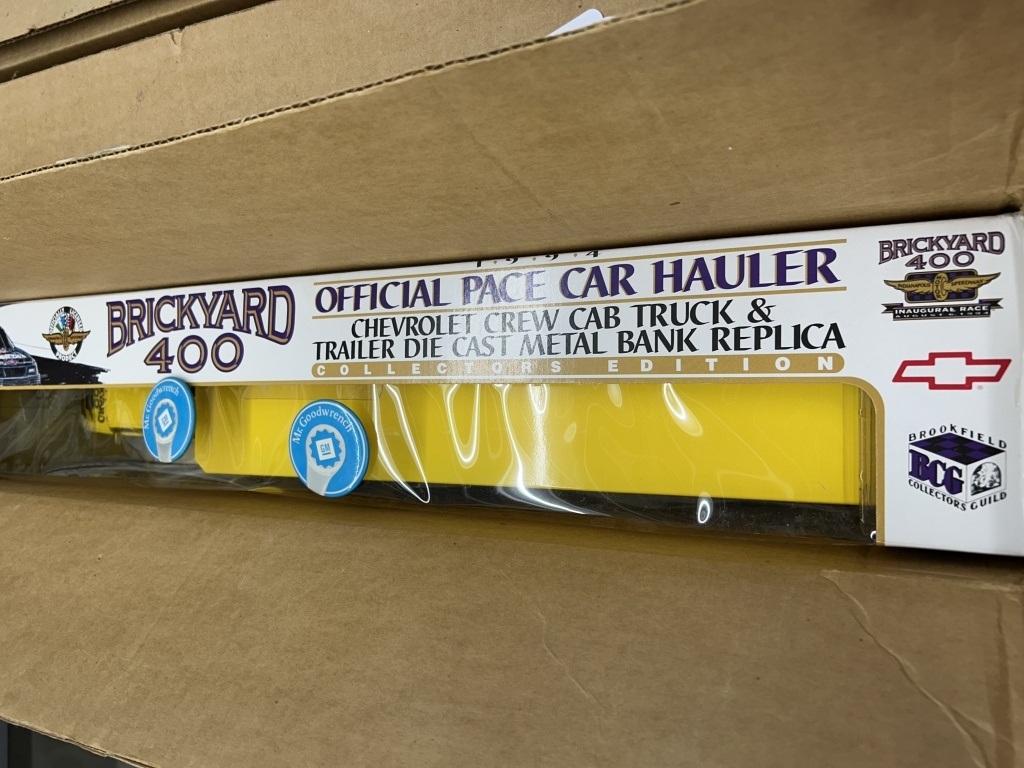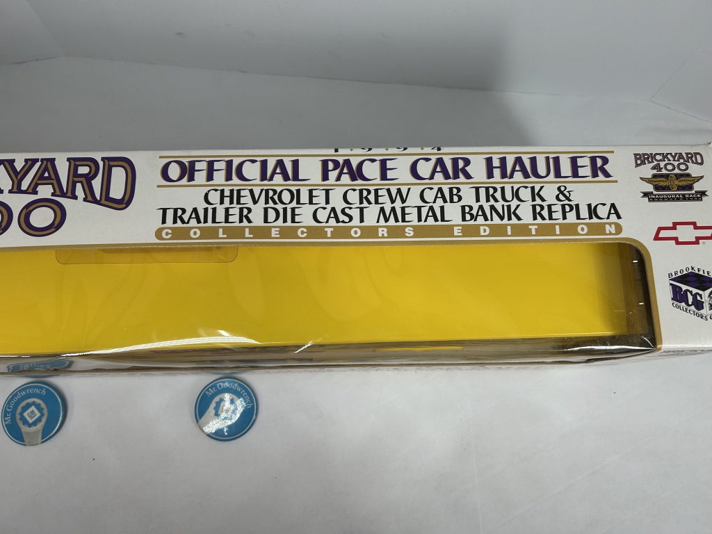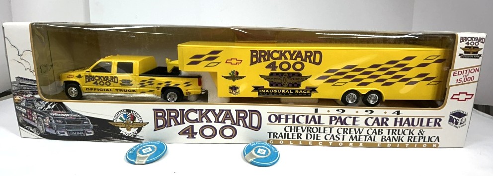 NOS 1994 BRICKYARD 400 OFFICIAL PACE CAR HAULER CHEVROLET CREW CAB TRUCK AND TRAILER DIE CAST METAL BANK REPLICA LIMITED EDITION OF 15,000 1:25 SCALE ORIGINAL BOX