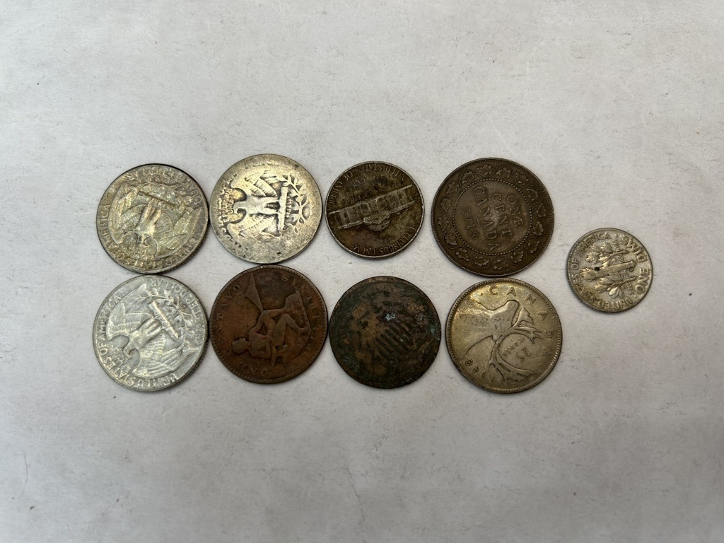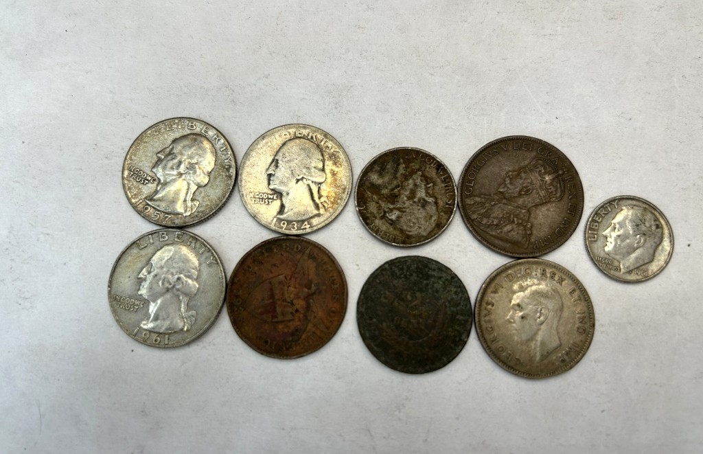 LOT INCLUDES 1934, 1961, AND 1957 QUARTERS, CANADIAN 25 CENT PIECE AND OTHER MISC COINS
