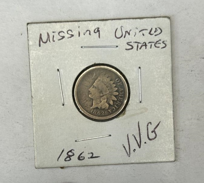 1862 INDIAN HEAD PENNY MISSING PRINTED “UNITED STATES”
