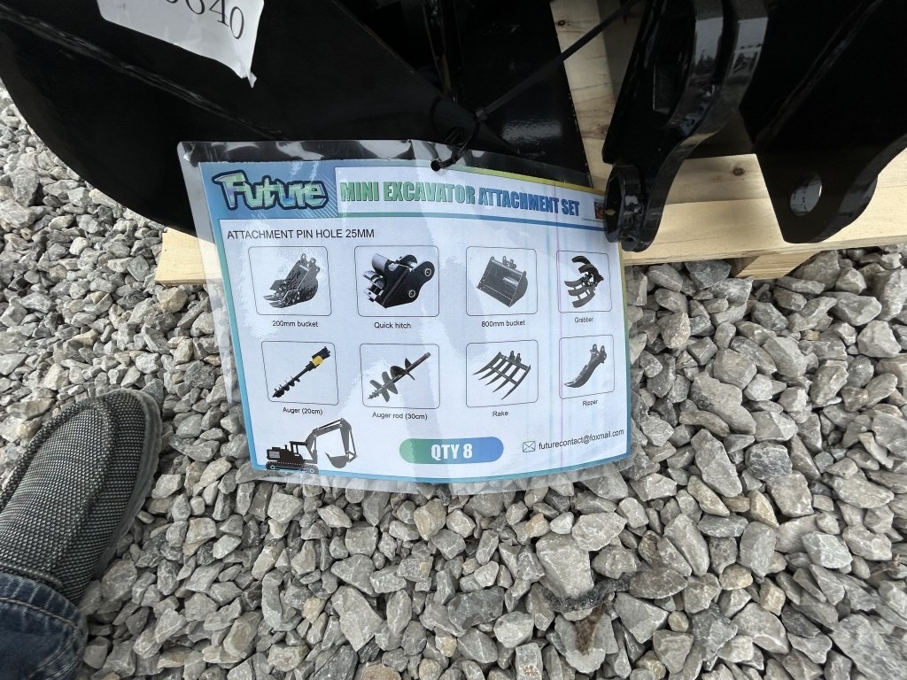 2025 FUTURE MINI EXCAVATOR ATTACHMENT SET INCLUDING 200MM BUCKET, QUICK HITCH, 800MM BUCKET, AUGER, AUGER ROD, RAKE, GRABBER, RIPPER