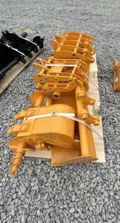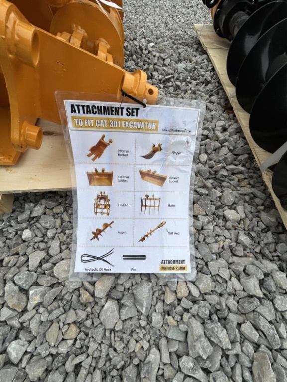 2025 CAT 301 EXCAVATOR ATTACHMENT SET INCLUDING BUCKET, RIPPER, 600MM BUCKET, 800MM BUCKET, GRABBER, RAKE, AUGER, DRILL ROD, HYDROLIC HOSES AND PIN