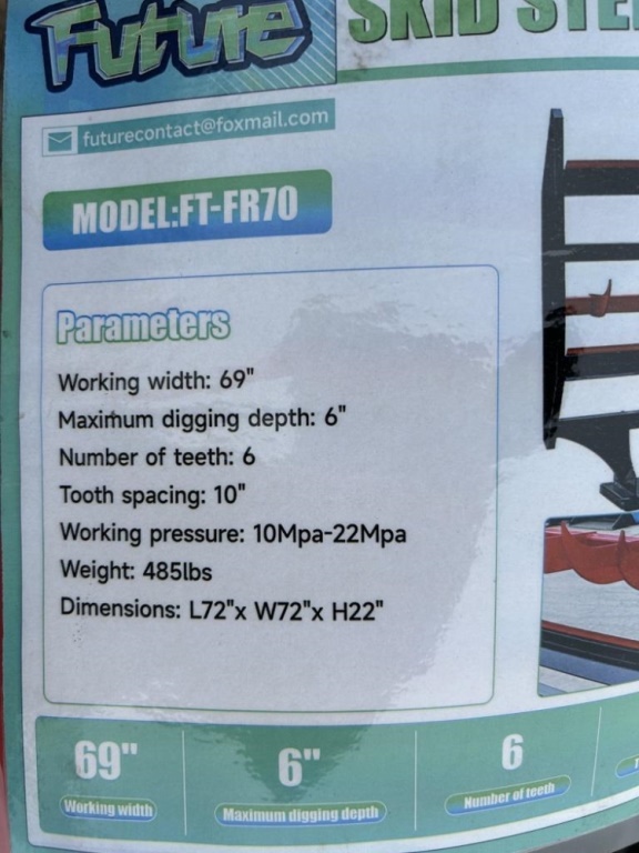 2025 FUTURE SKID STEER LEVELER WORKING WIDTH 69″ MAX DIGGING DEPTH 6″, 6 TEETH 10 INCHES APART, L72″XW72″XH22″ MODEL: FT-FR70