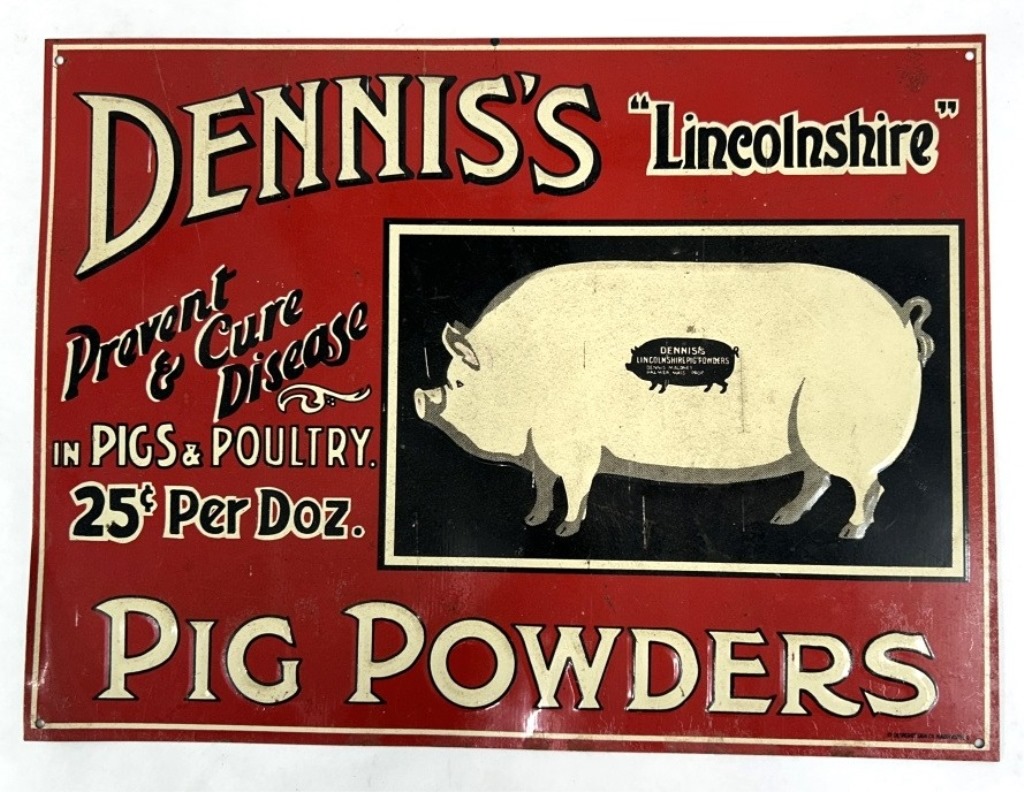 DENNIS’S “LINCOLNSHIRE” PIG POWDERS EMBOSSED METAL SIGN 13.5″X10″