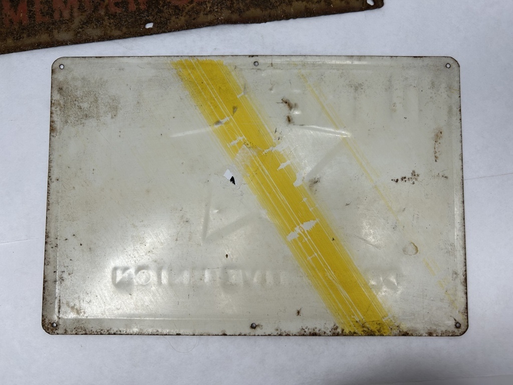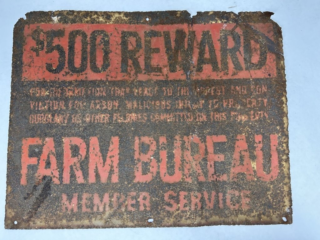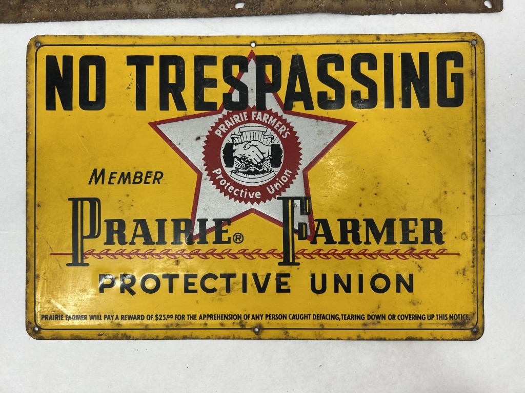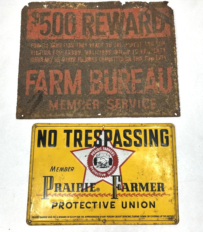 PRAIRIE FARMER PROTECTIVE UNION EMBOSSED METAL SIGN 12″X8″ AND FARM BUREAU METAL SIGN 14″X11″