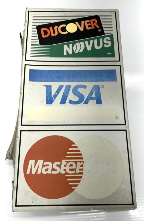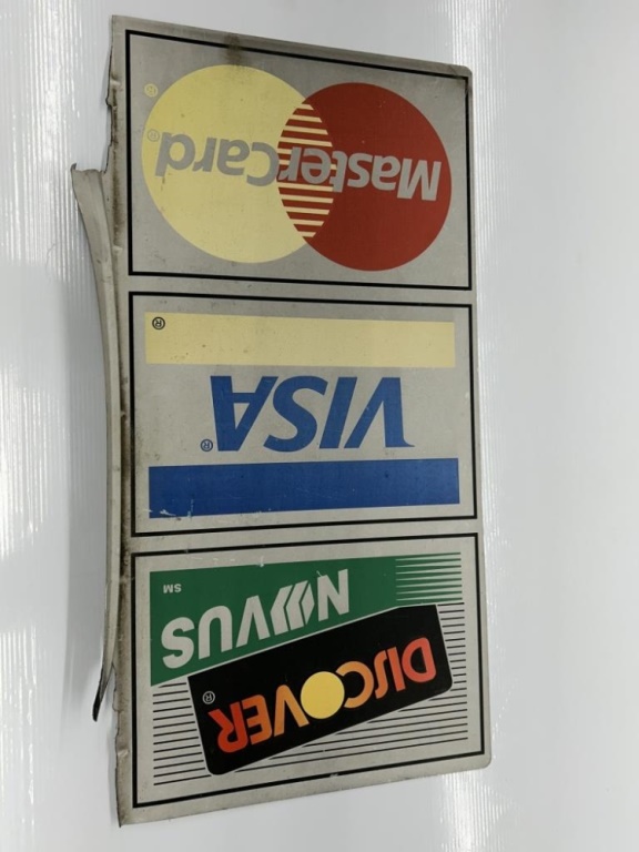 VINTAGE DOUBLE SIDED METAL FLANGE CREDIT CARD SIGN 16″X31.5″