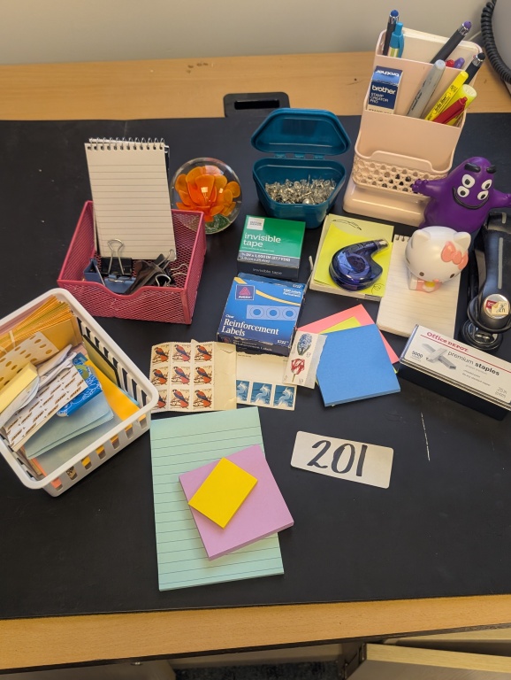 STICKY NOTES, WHITE OUT, PENS, CADDY, PAPERWIGHT,
