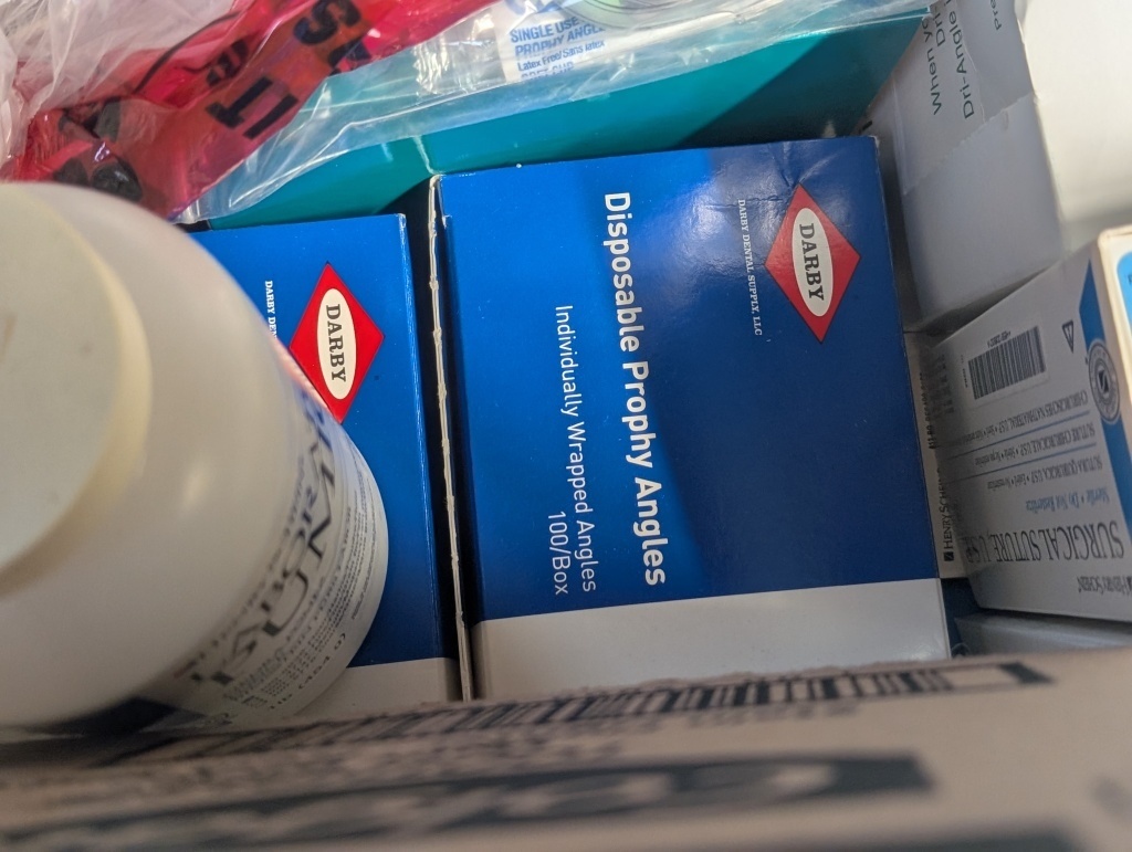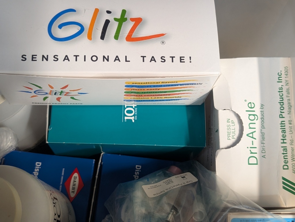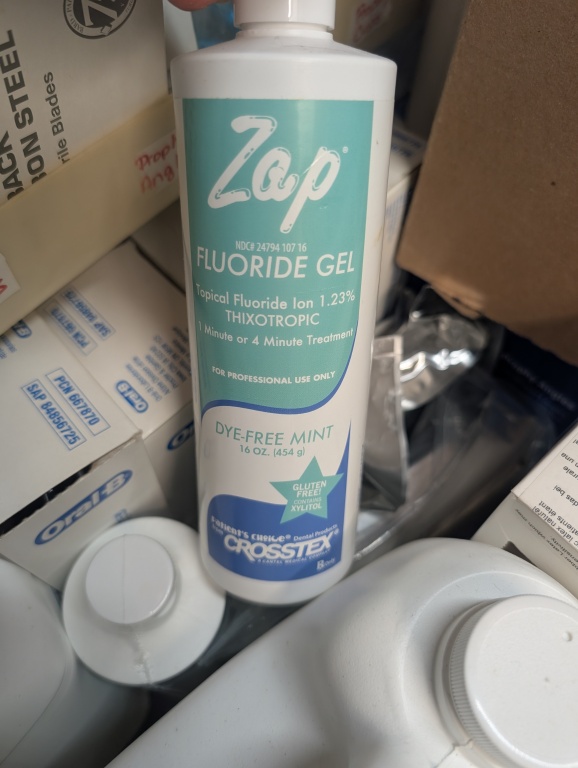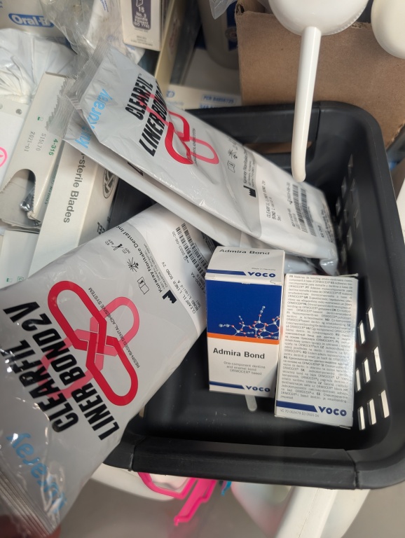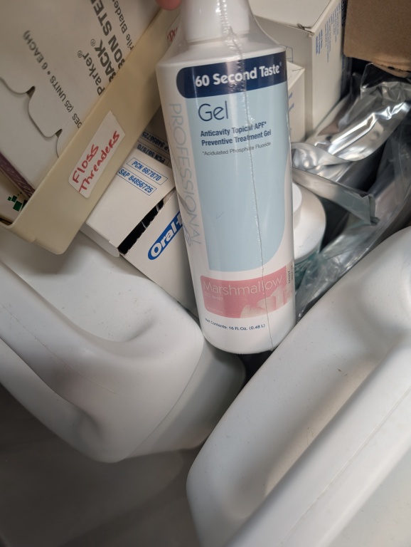 SANITIZER, FLUORIDE GEL, HYDROGEN PEROXIDE, ADMIRA BOND, BLADES, PUMPS, TOOTH BRUSHES, AND MISC ITMES