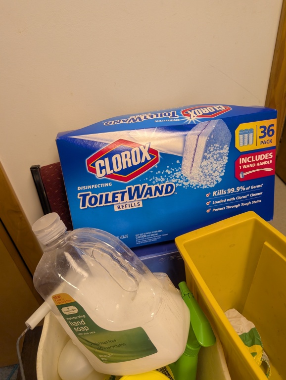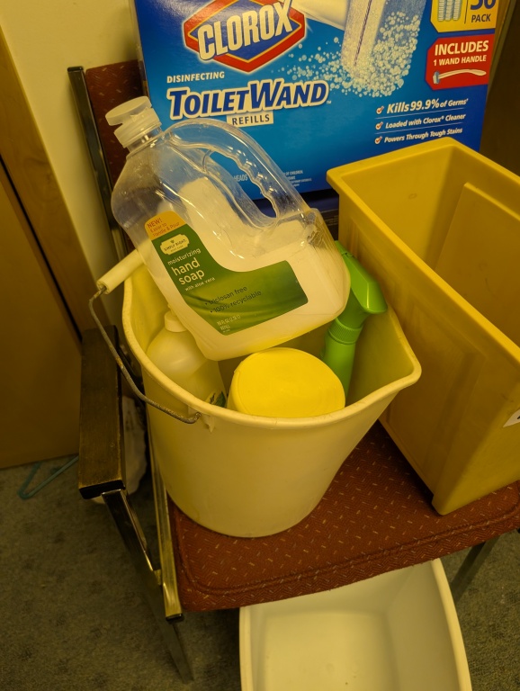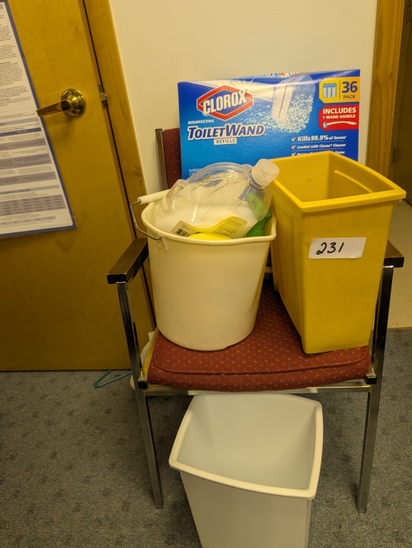 CHAIR, TRASH CANS, AND CLEANING SUPPLIES