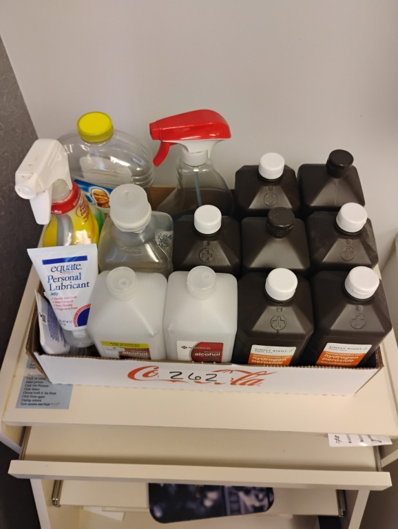 CLOROX SPRAY, WINDEX, LUBRICANT, RUBBING ALCOHOL, HYDROGEN PEROXIDE