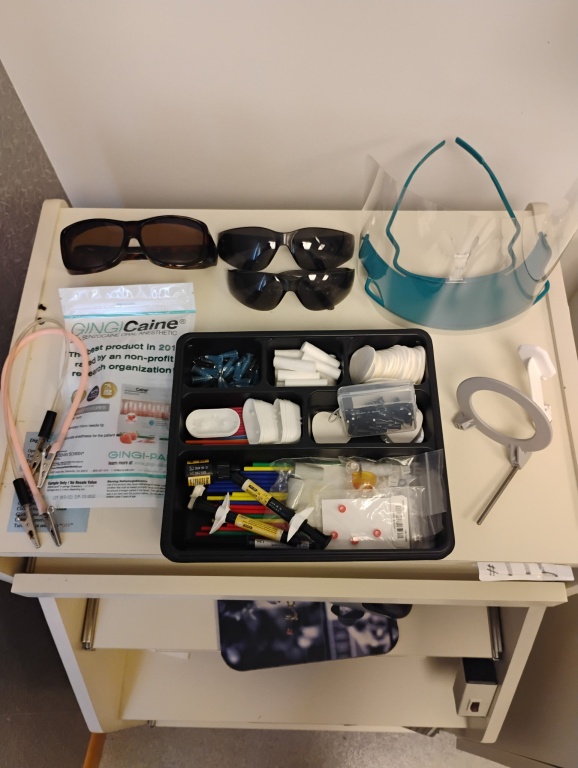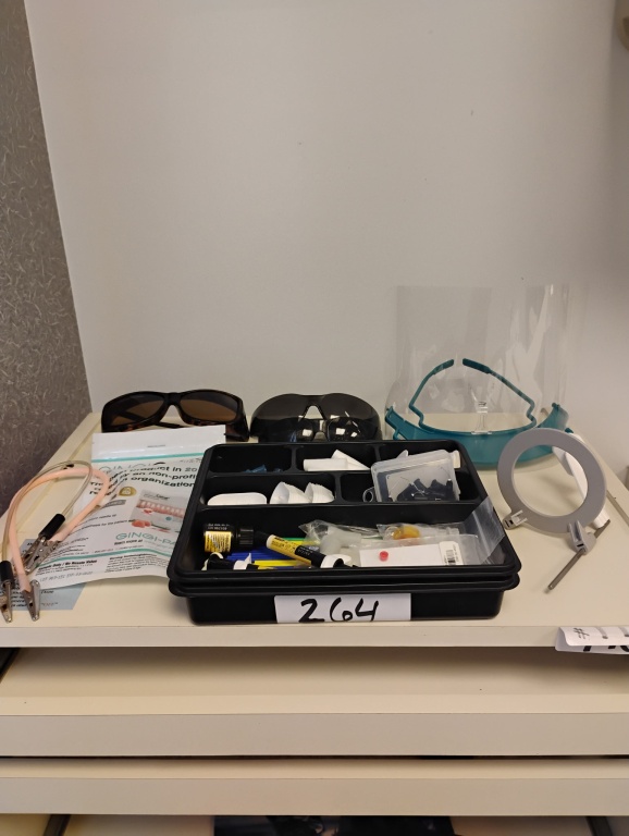 GLASSES, FACE SHIELD, TRAY OF EXAM ROOM ESSENTIALS, AND MORE