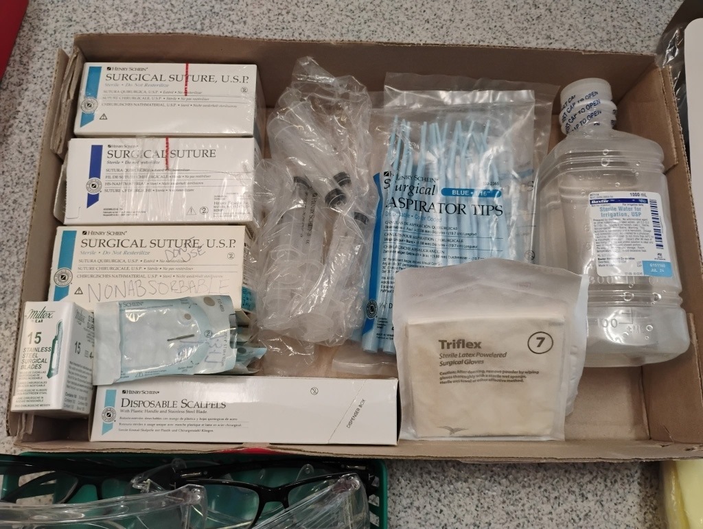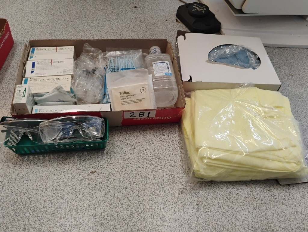 GOWNS, SUTURES, GLASSES, STERIL WATER, SCAPELS, SYRINGES ADN MORE