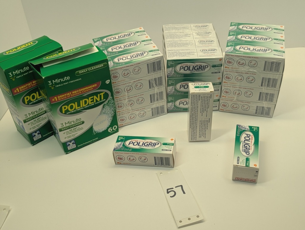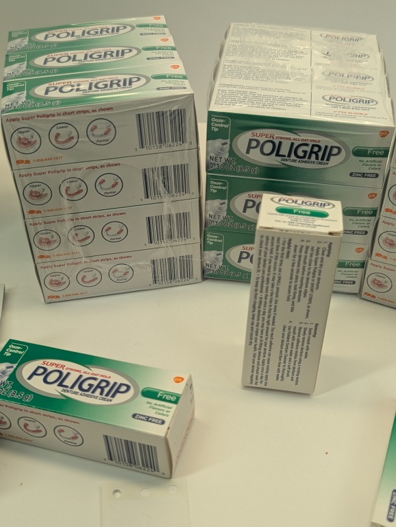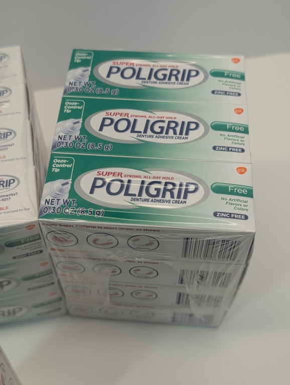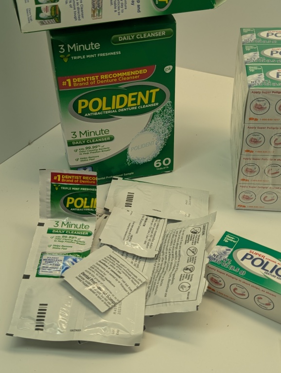 MULTIPLE POLIDENT ANTIBACTERIAL DENTURE CLEANER EXP. 6/23, MULTIPLE SUPER STONG, ALL-DAY HOLD POLIGRIP DENTURE ADHESIVE CREAM ZINC FREE EXP. 8/22