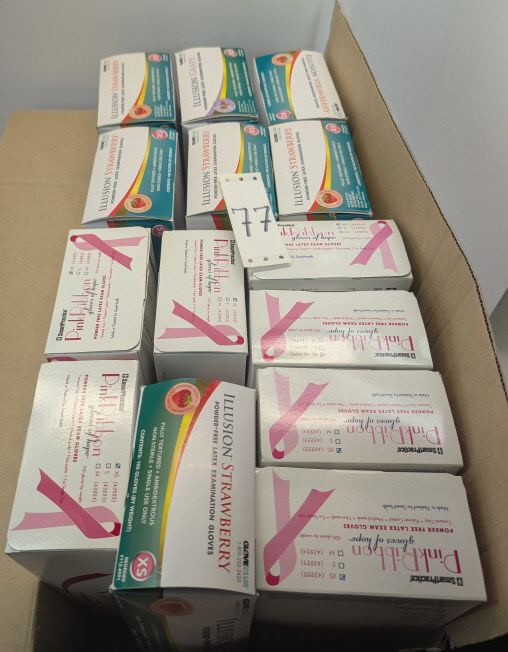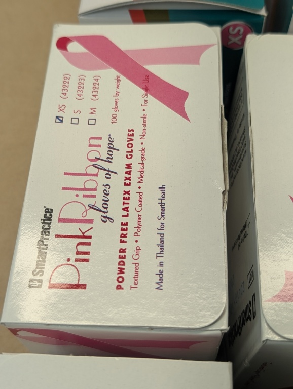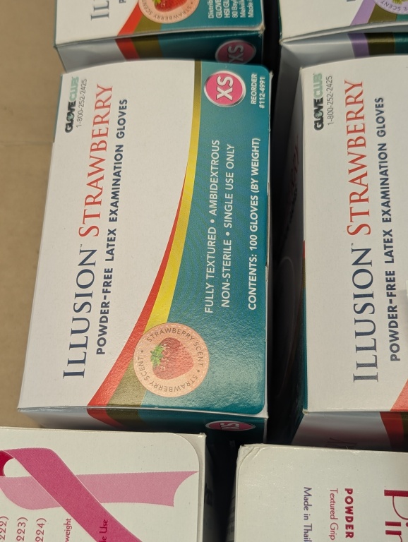 14 BOXES OF XS LATEX POWDER FREE EXAM GLOVES, PINK RIBBON GLOVES OF HOPE & ILLUSION STRAWBERRY