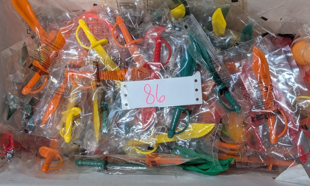BOX OF INDIVIDUALLY WRAPPED TOY MINI SWORDS