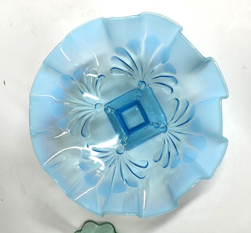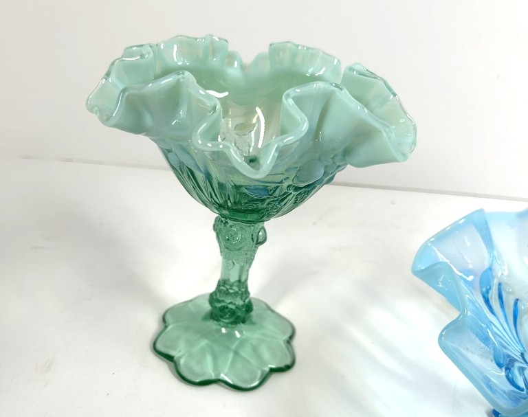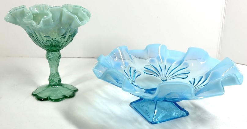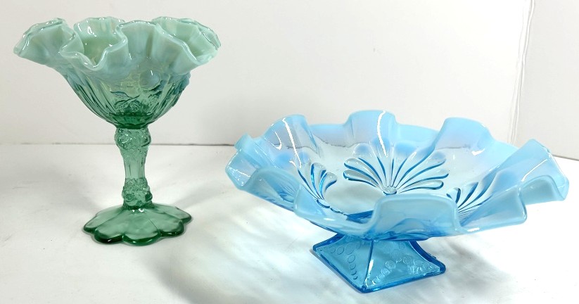 FENTON GREEN OPALESCENT COMPOTE AND BLUE OPALESCENT BOWL