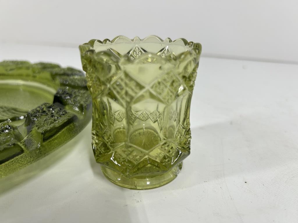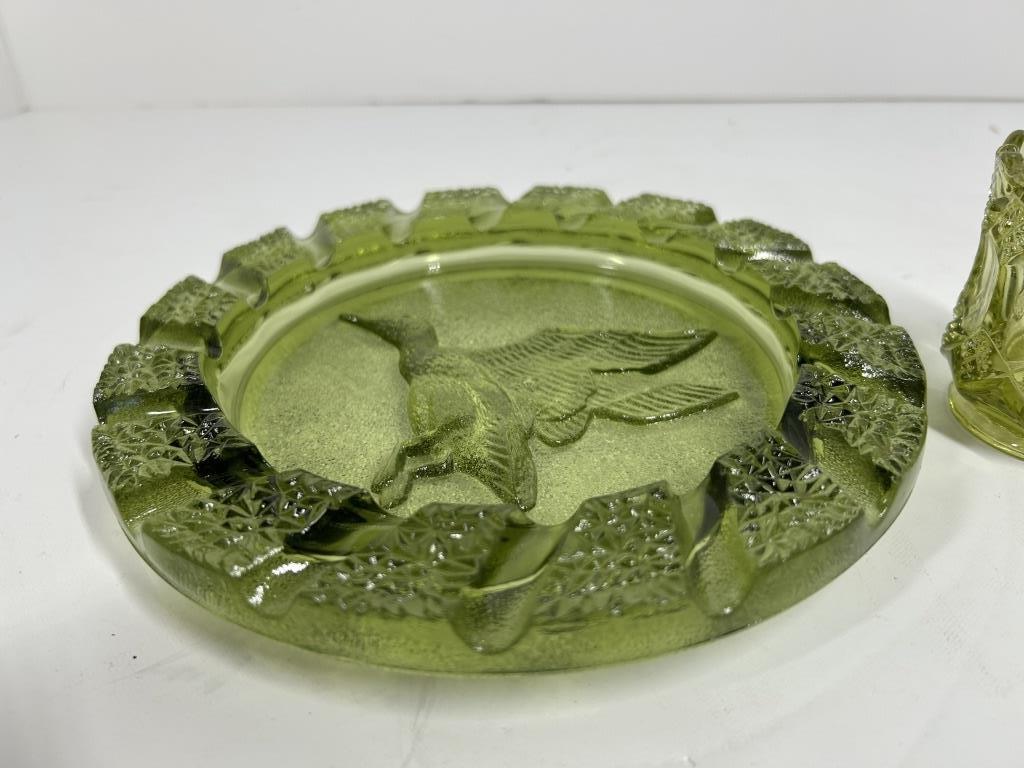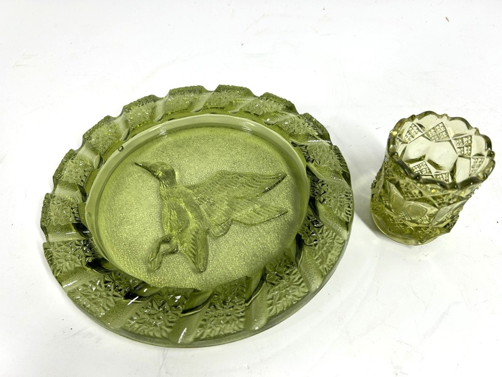 GREEN ASHSTRAY WITH BIRD AND TOOTHPICK HOLDER