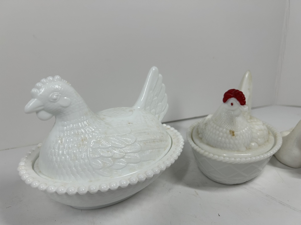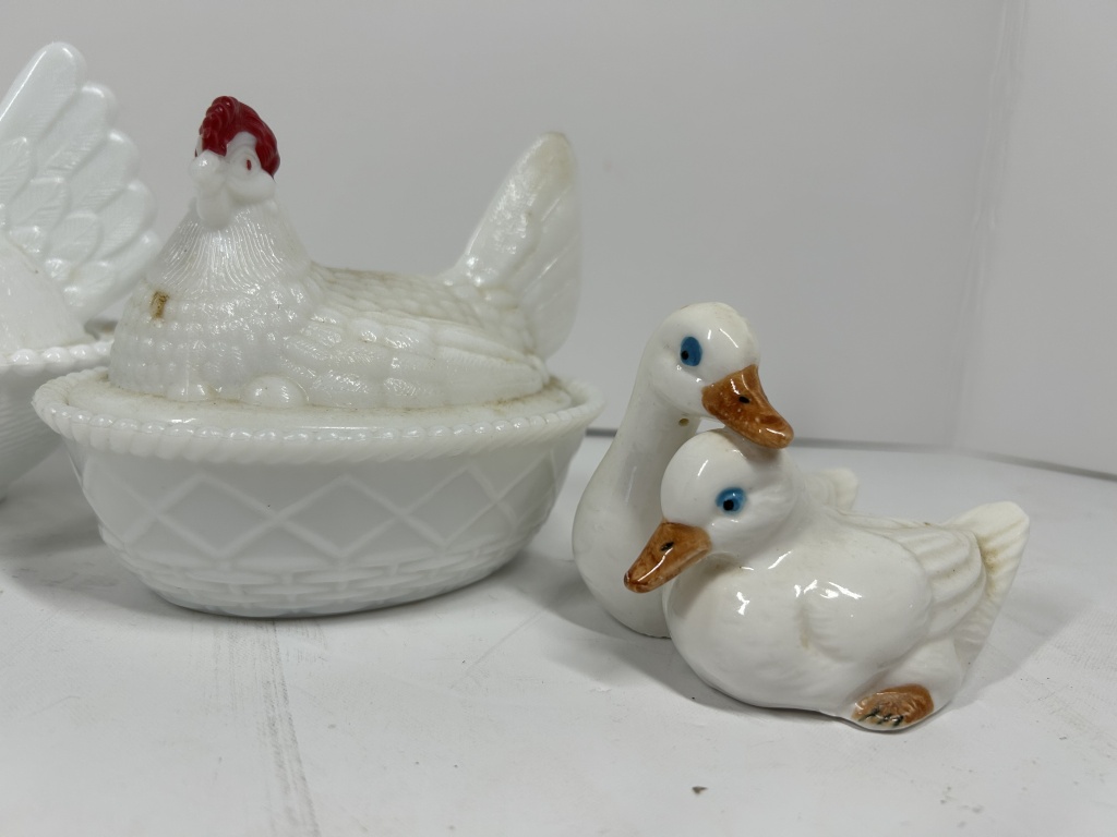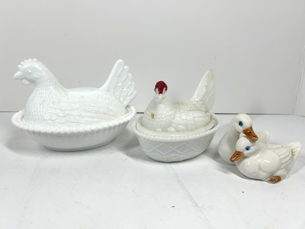 HEN ON NEST AND GOOSE FIGURINES