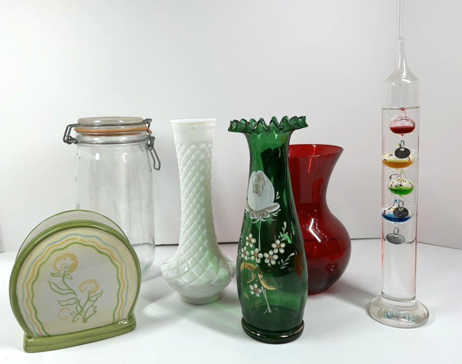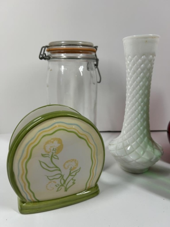 VINTAGE GLASSWARE AND NAPKIN HOLDER, EMBOSSED JAR