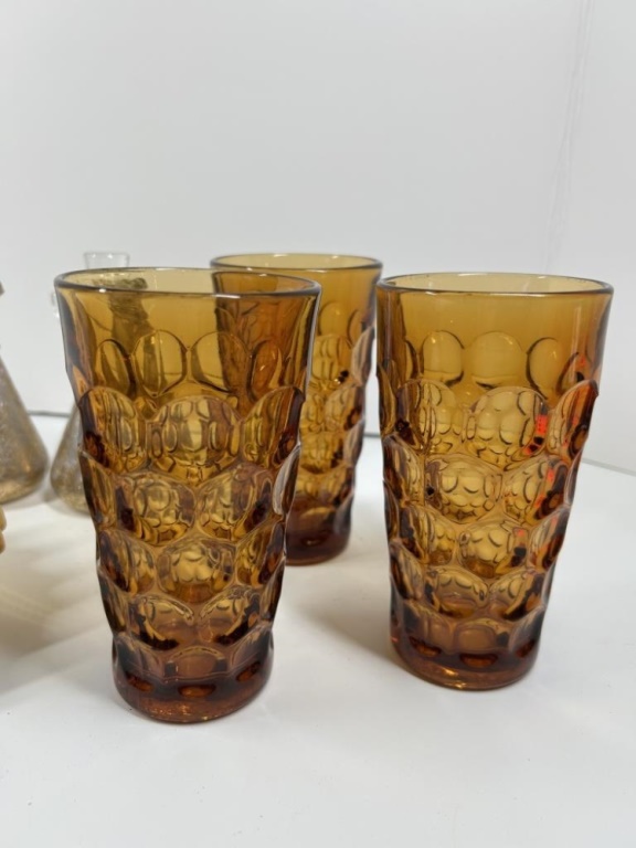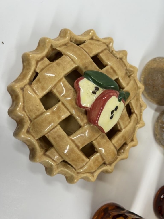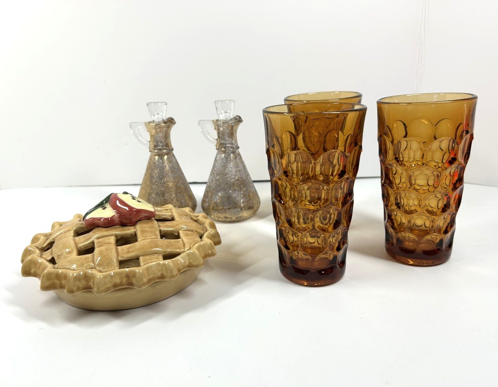 CERAMIC PIE DISH AND 3 AMBER GLASSES