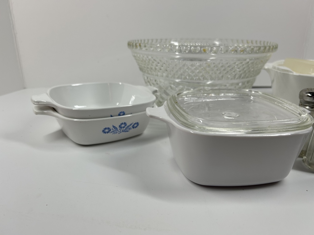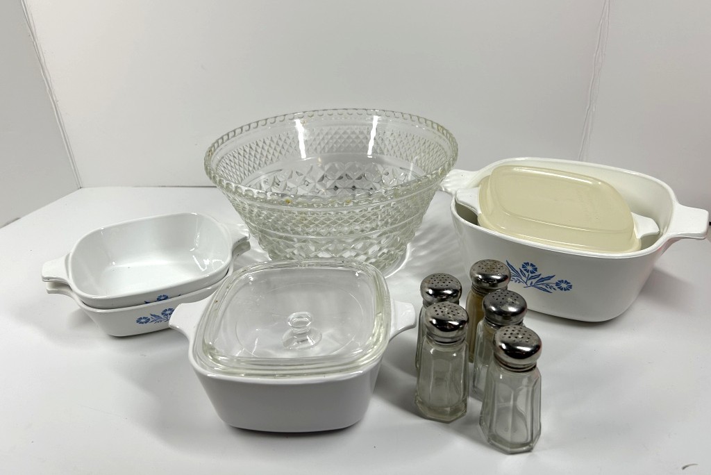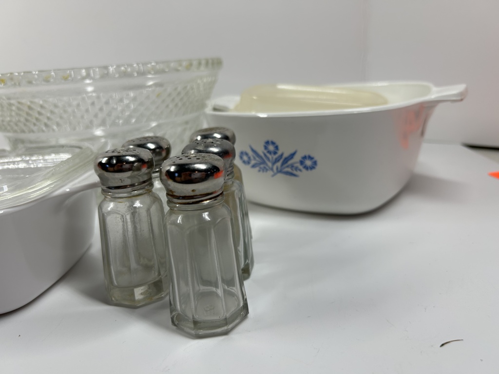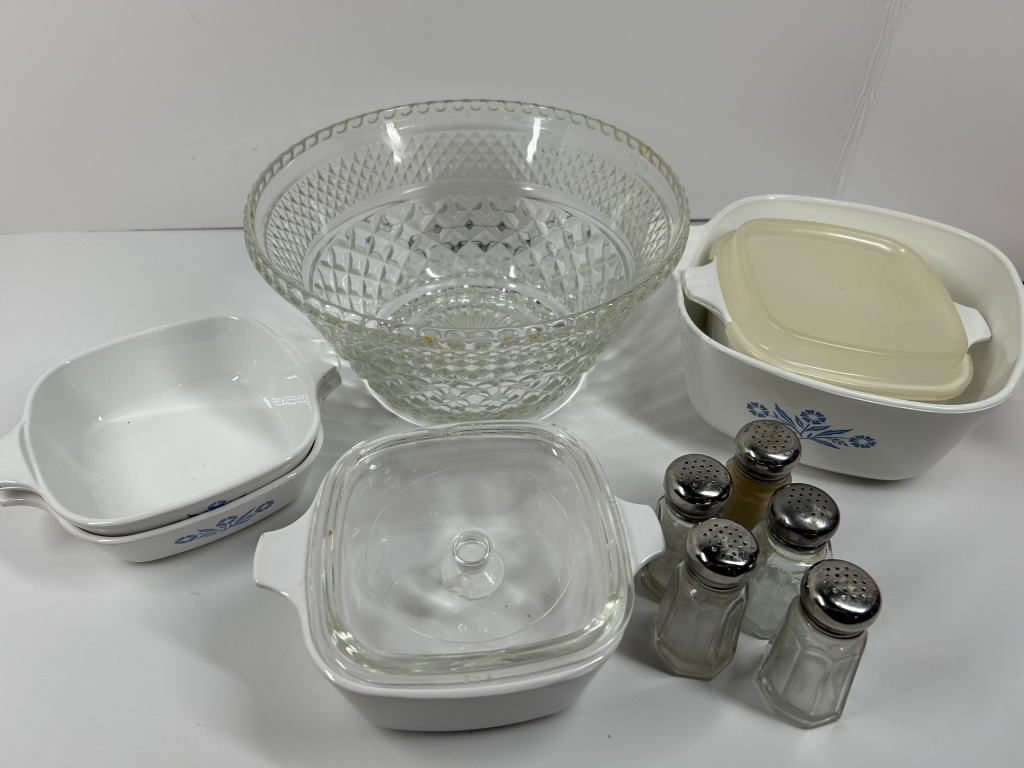 VINTAGE CORNINGEARE WITH SALT AND PEPPER SHAKER AND PUNCH BOWL
