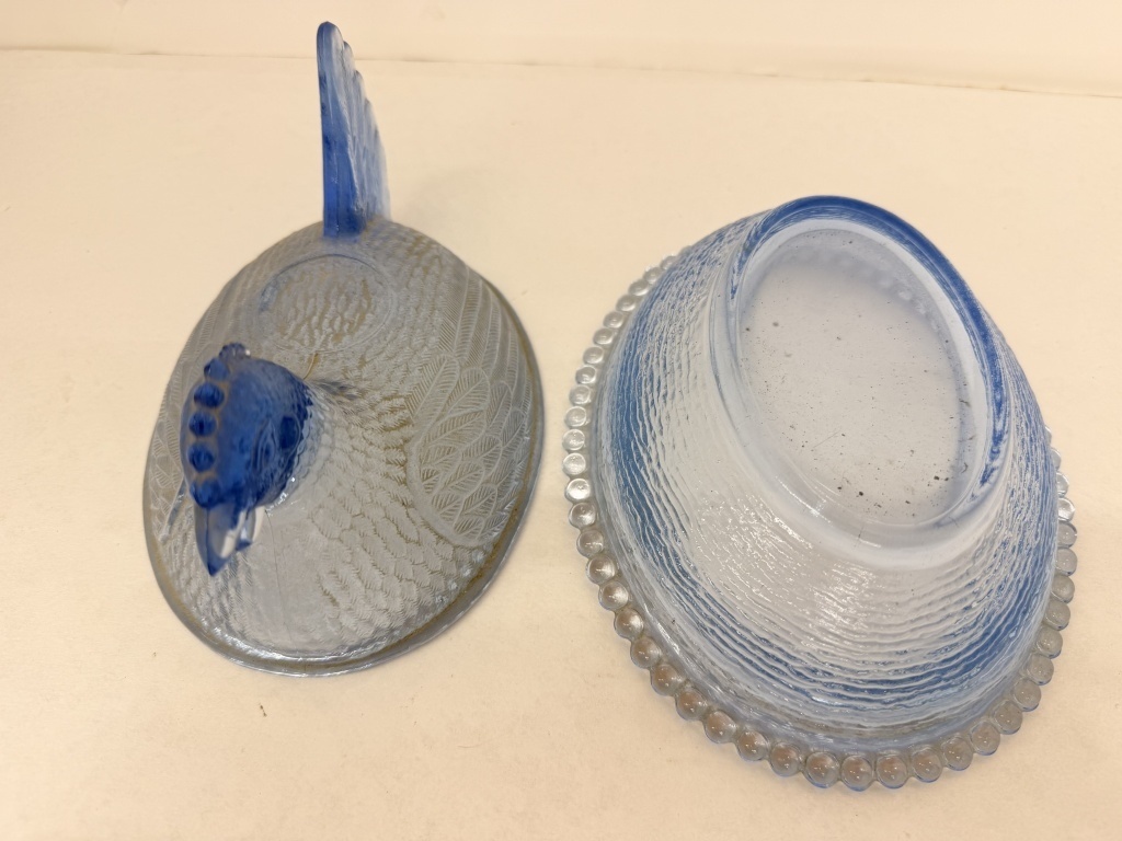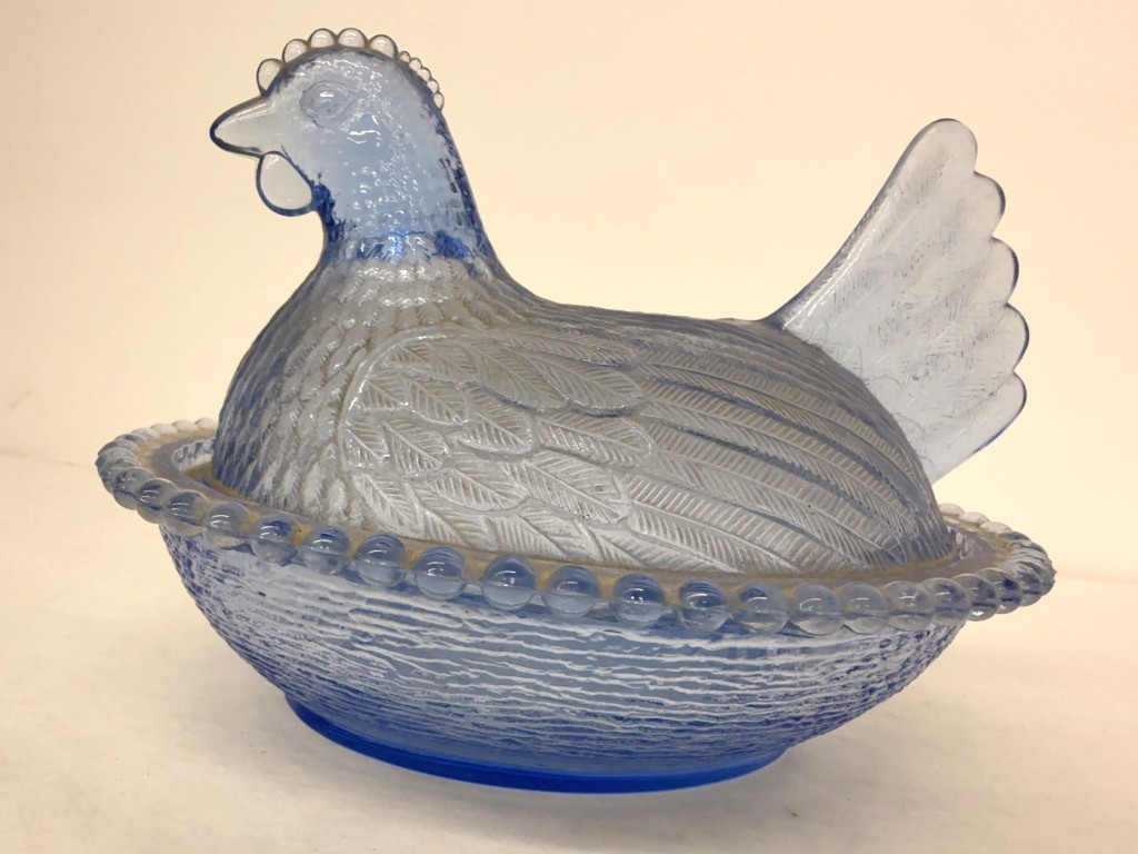 INDIANA GLASS LIGHT BLUE HEN ON NEST LIDDED DISH