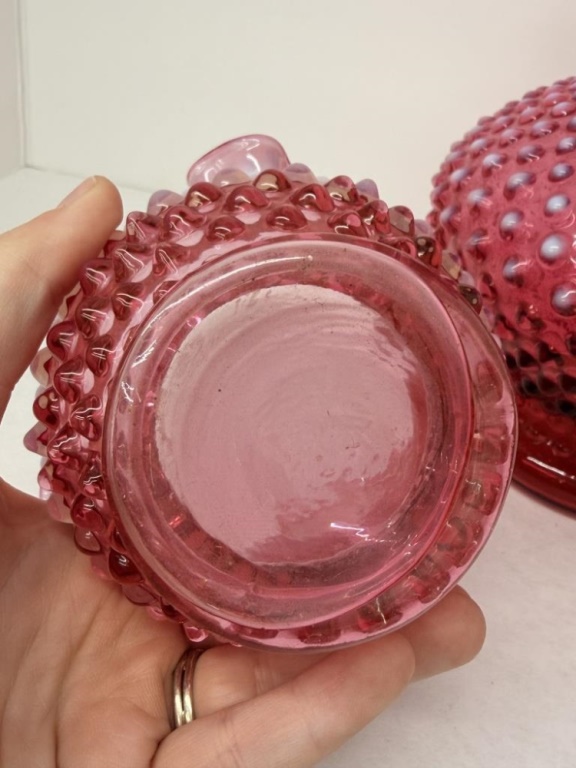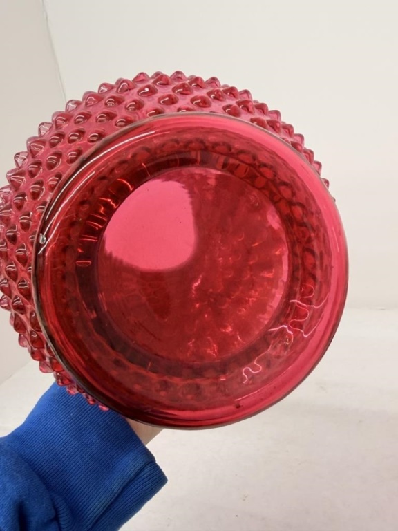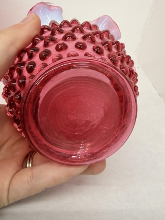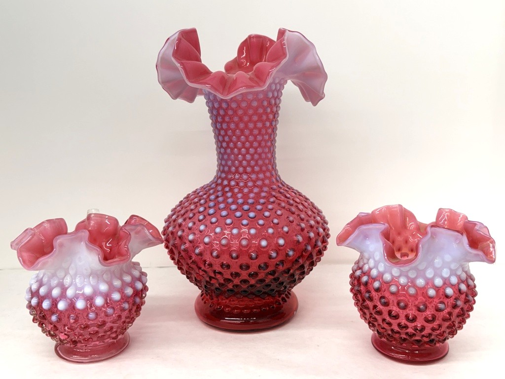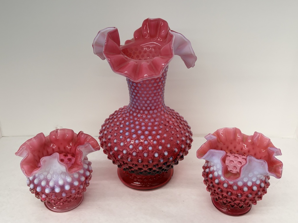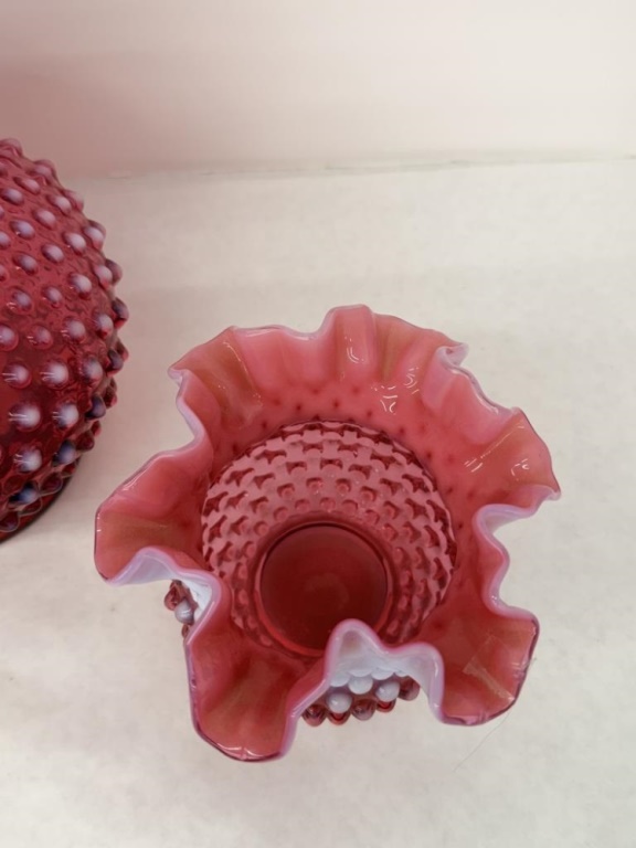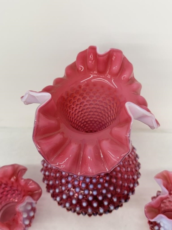 PITCHER SET FENTON CRANBERRY OPALESCENT RUFFLED GLASS VASE SET