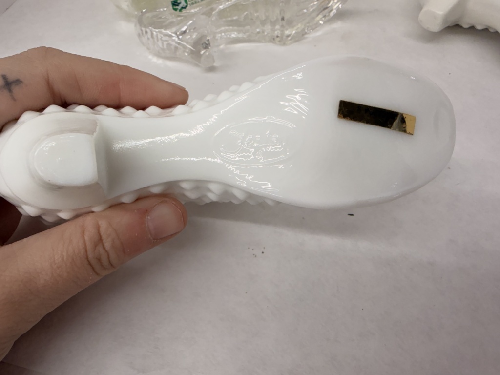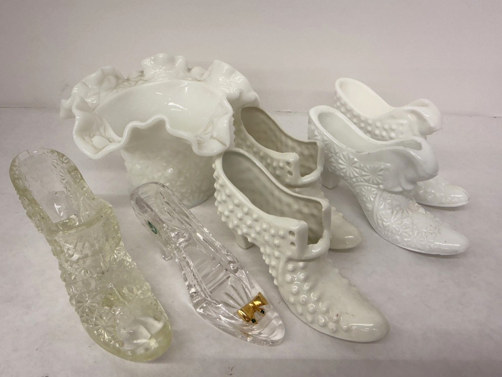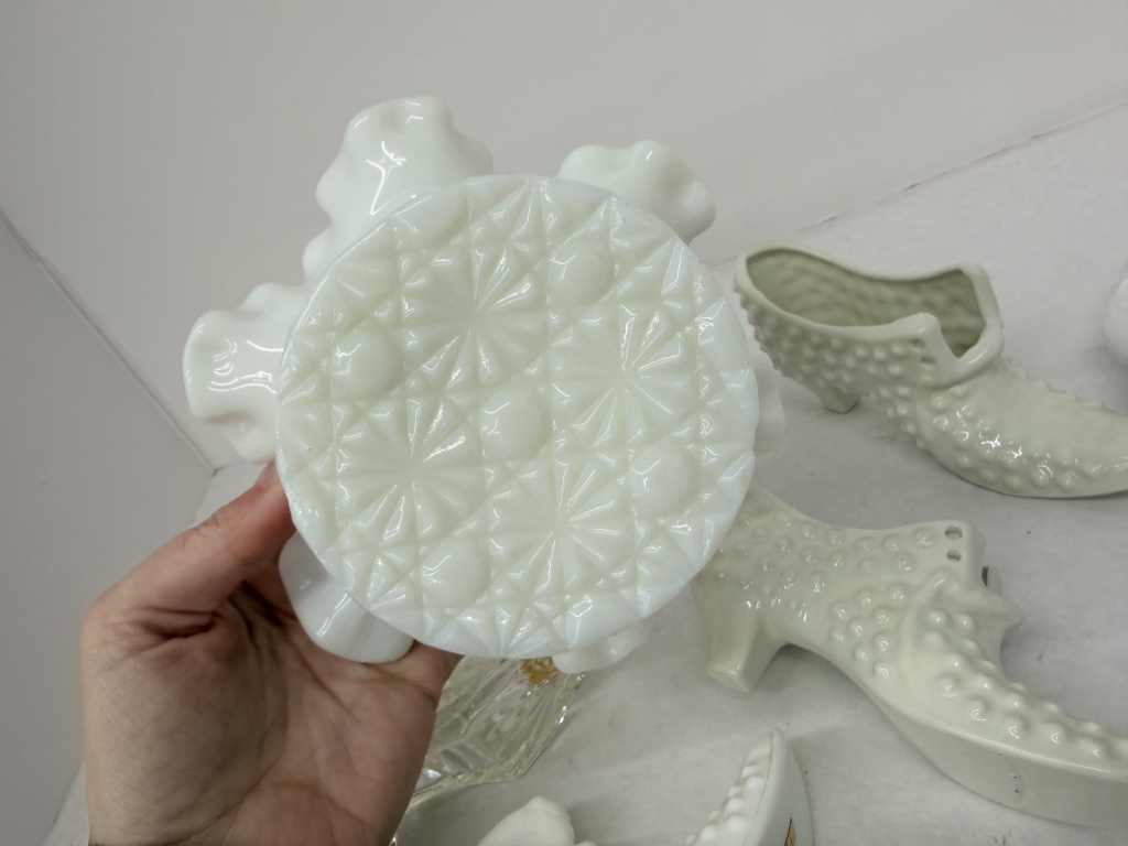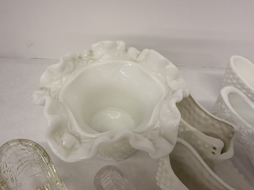 ASSORTMENT OF MILK GLASS & CRYSTAL BOOTS, RUFFLED EDGE DISH