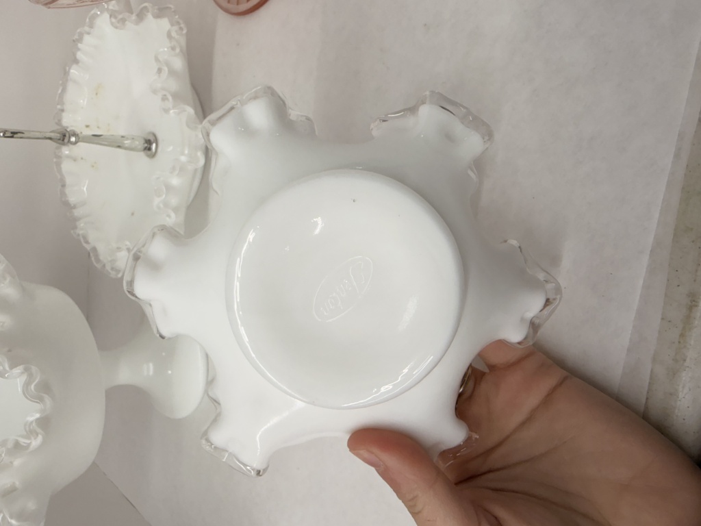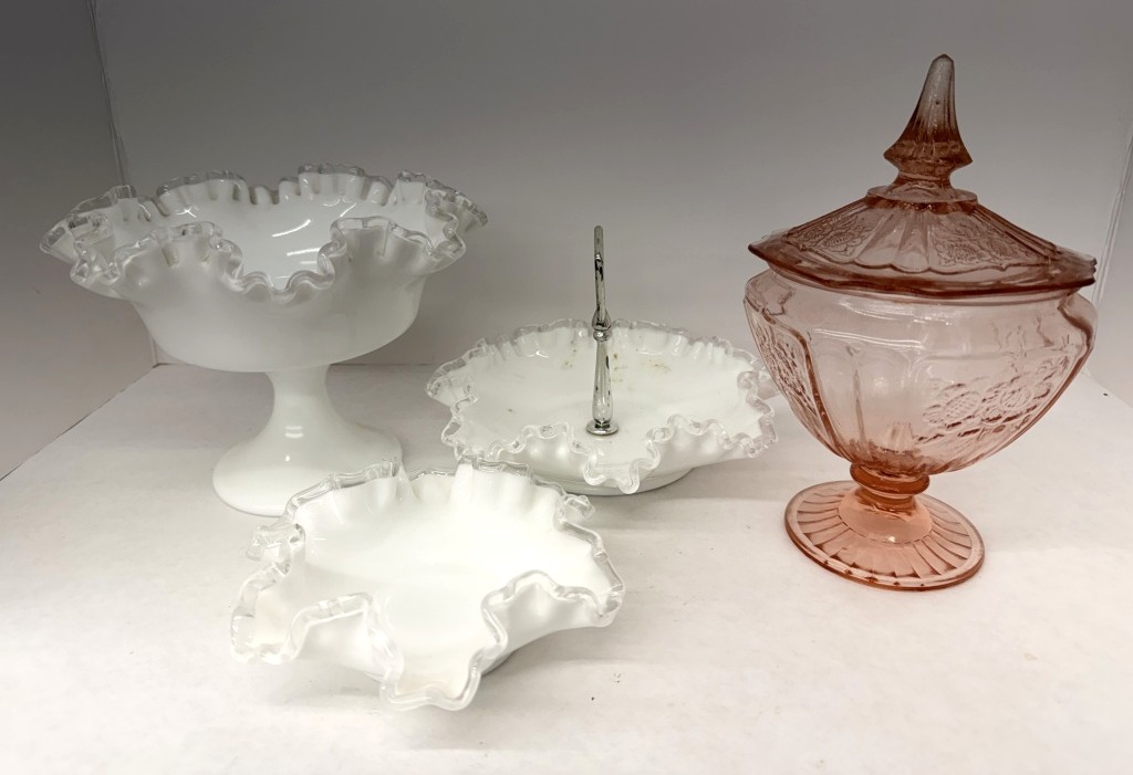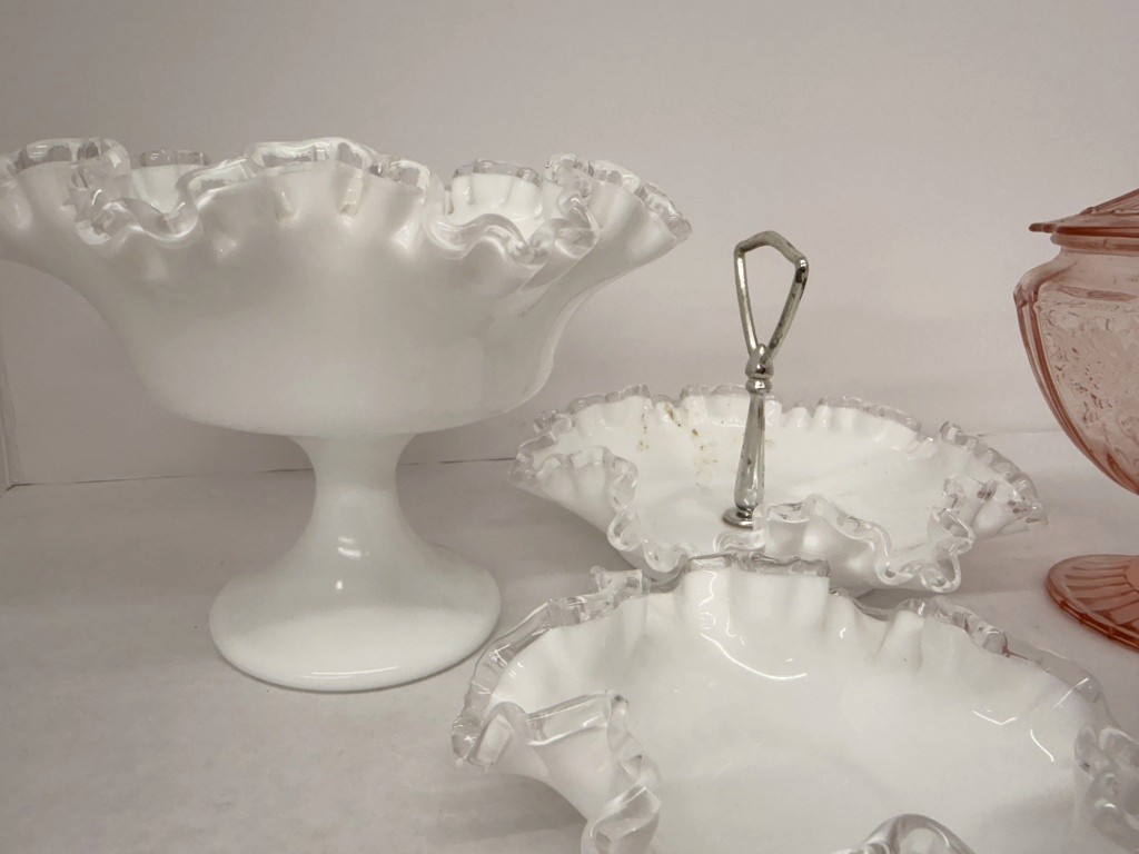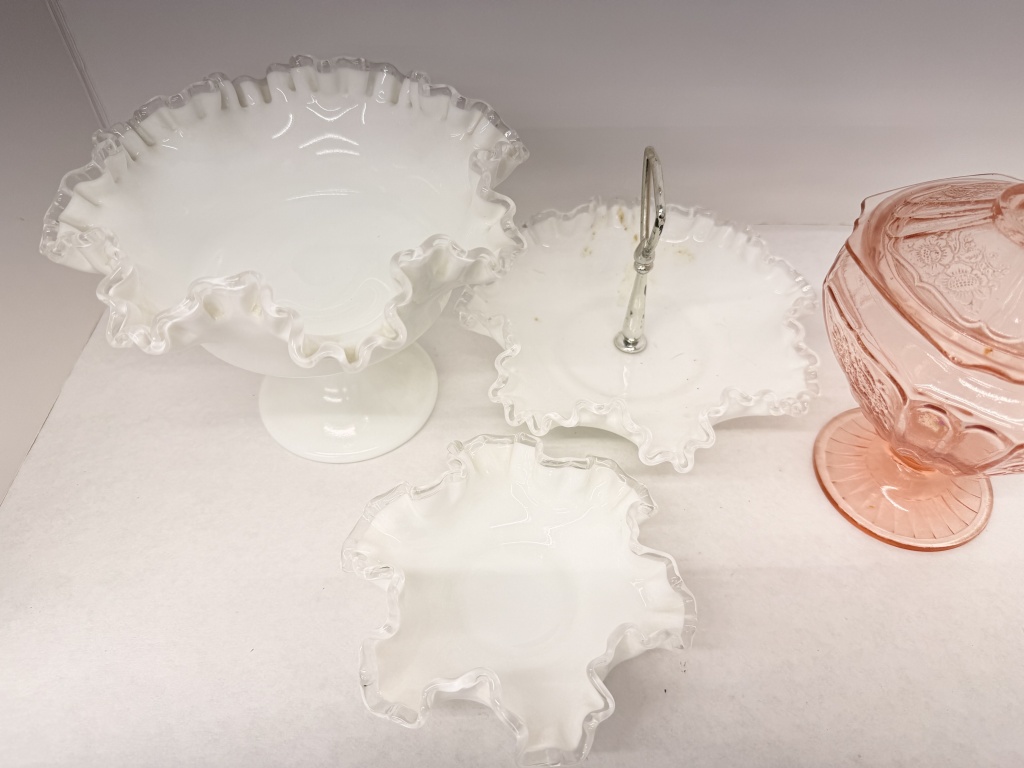 MILK GLASS COMPOTES, SERVING DISHES, AND PINK DEPRESSION GLASS CANDY DISH