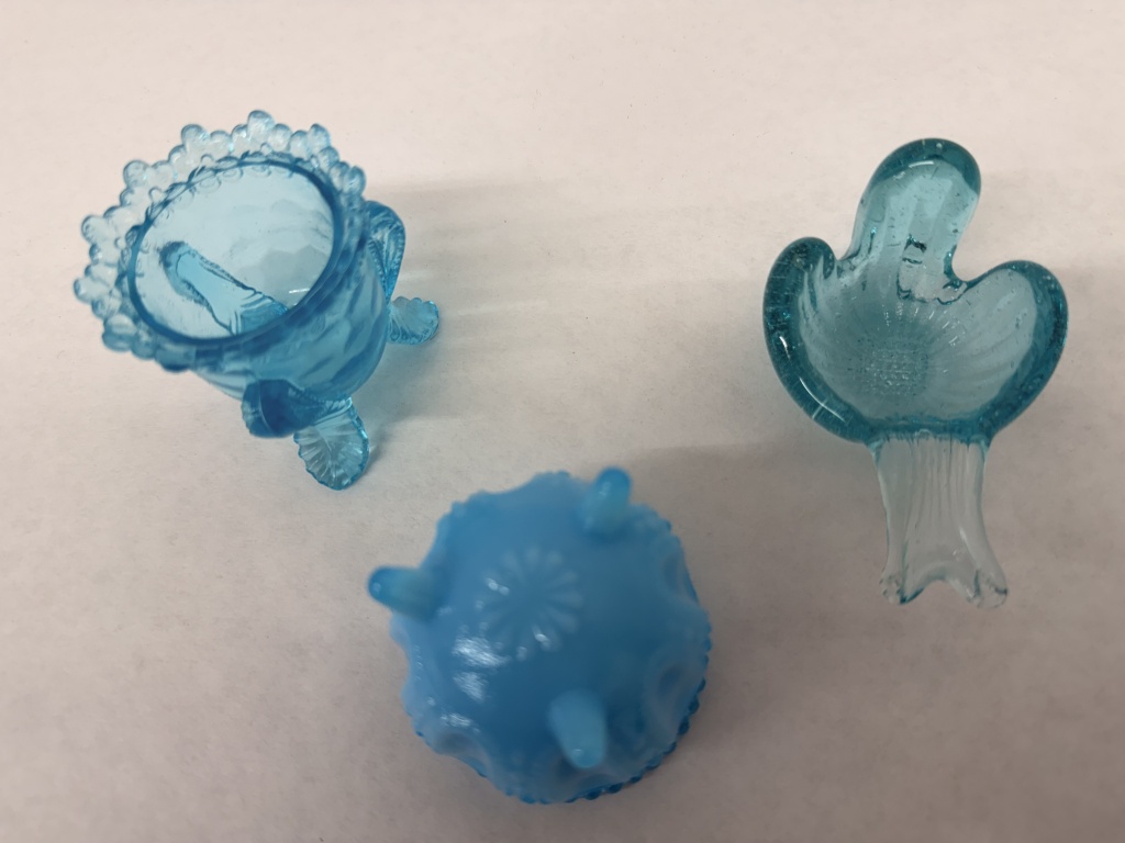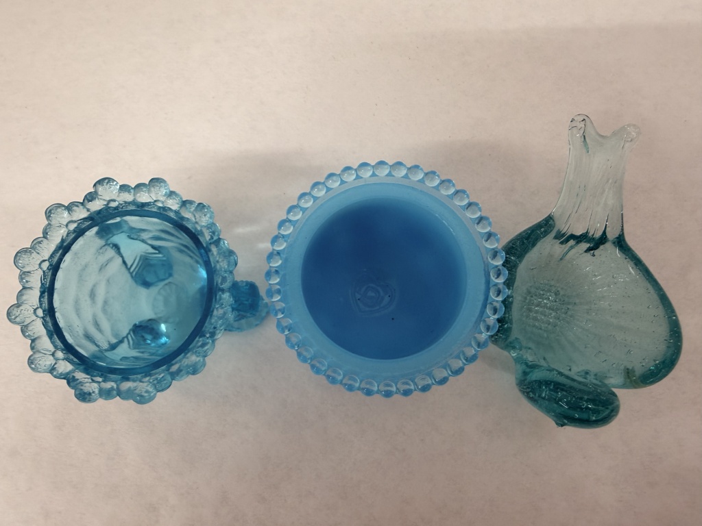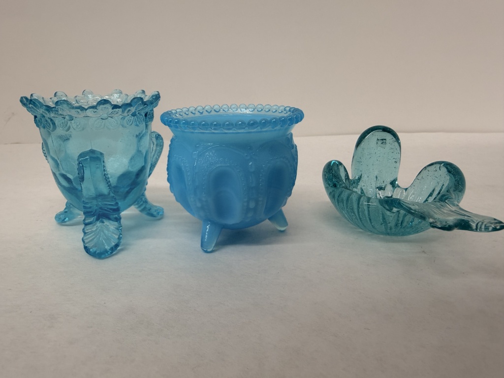 DEGENHART FORGET-ME-NOT BLUE MILK GLASS FOOTED TOOTHPICK HOLDER, DEGENHART GYPSY POT, AND BIRD TRINKET DISH