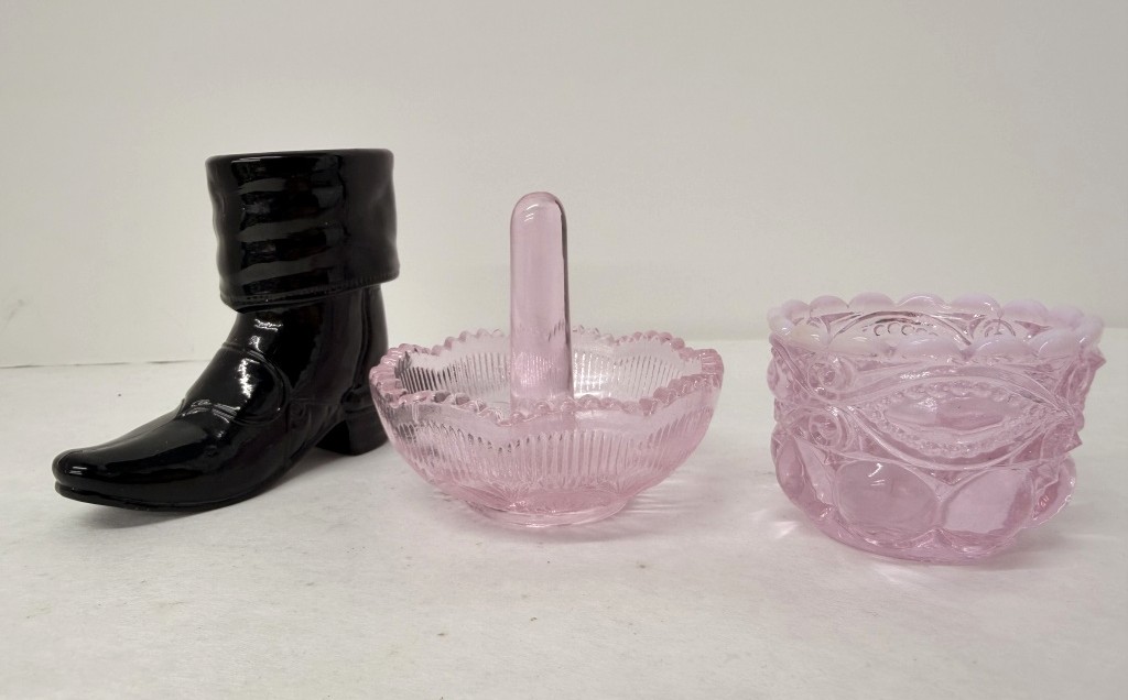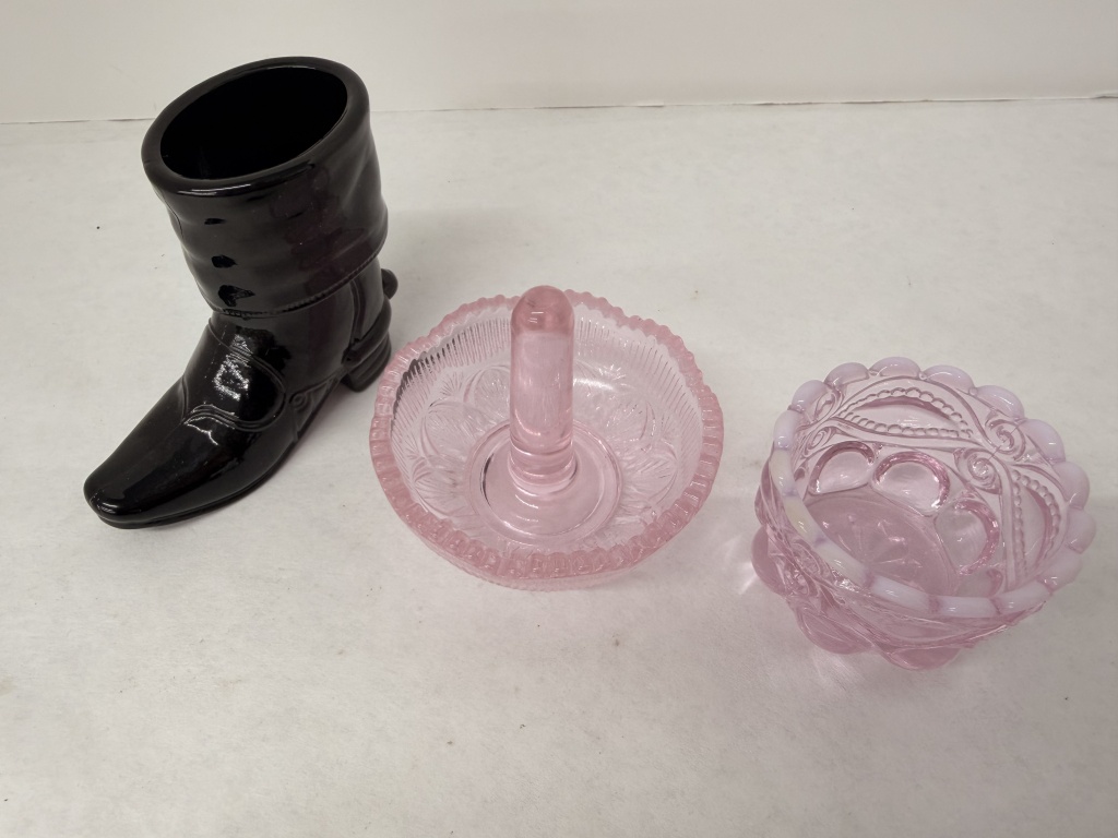 BLACK GLASS BOOT, SALT DISH, AND RING HOLDER
