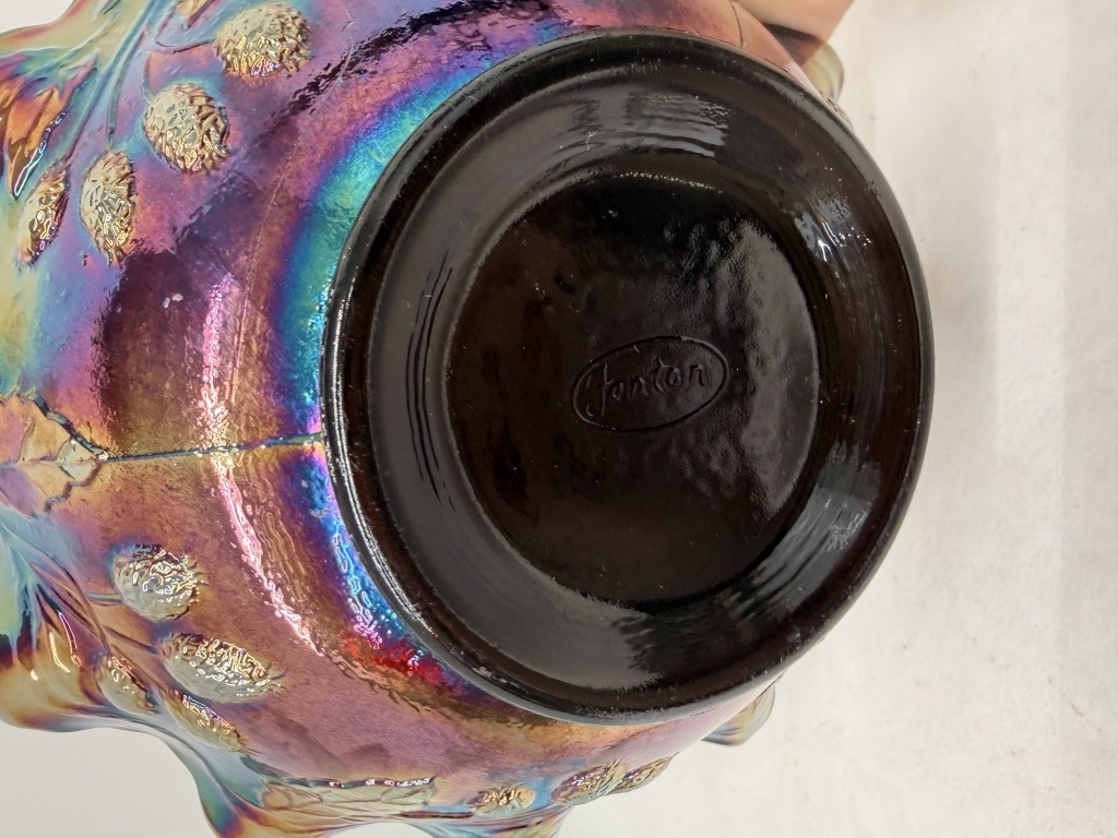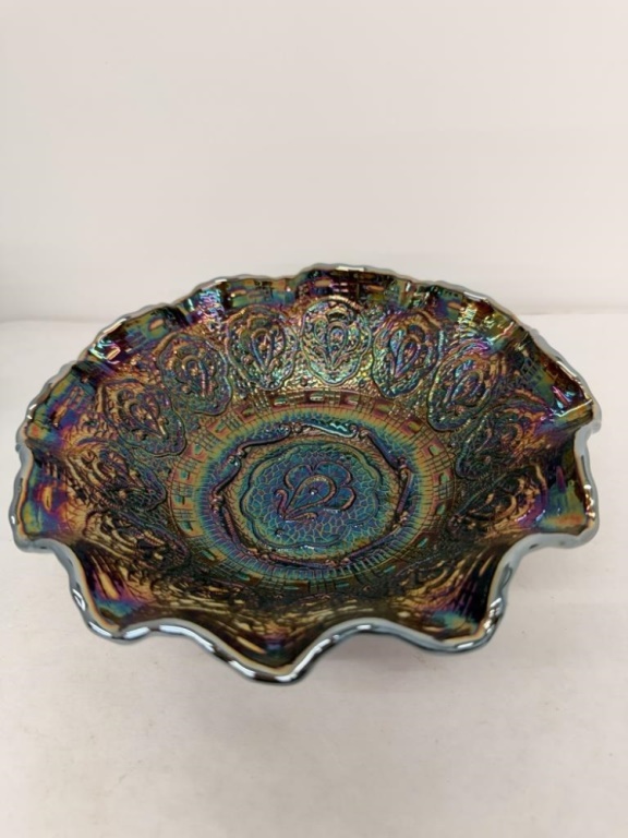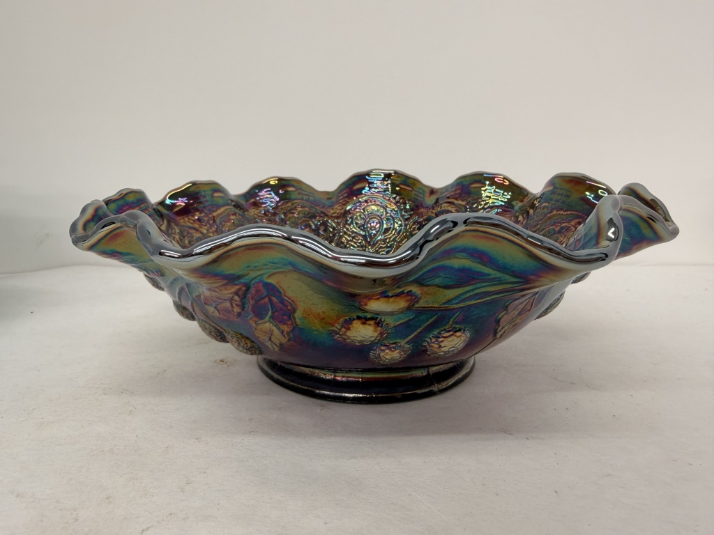 PURPLE IRIDESCENT RUFFLE CARNIVAL GLASS BOWL