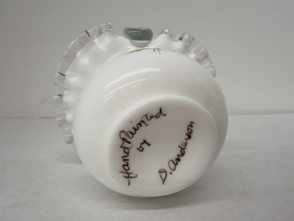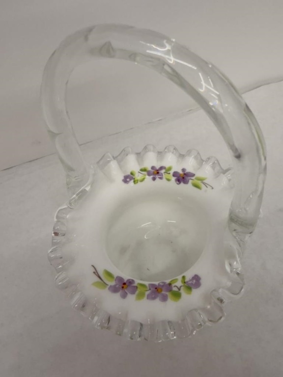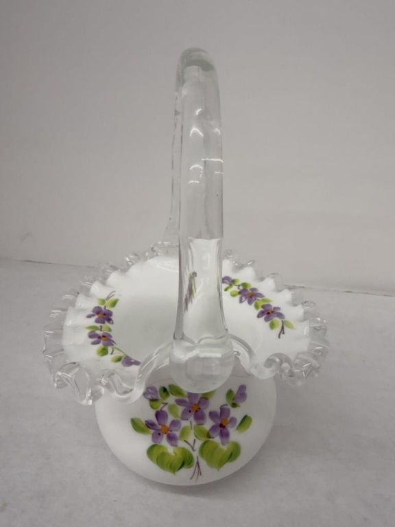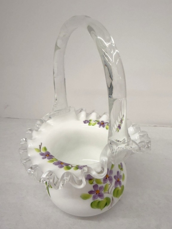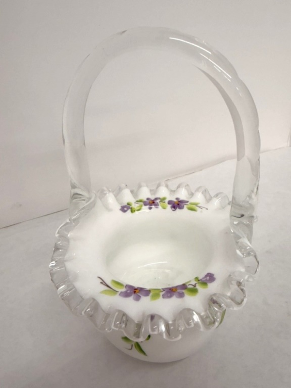 HANDLED BASKET SILVER CREST MILK GLASS HAND PAINTED VIOLETS IN THE SNOW BASKET – SIGNED