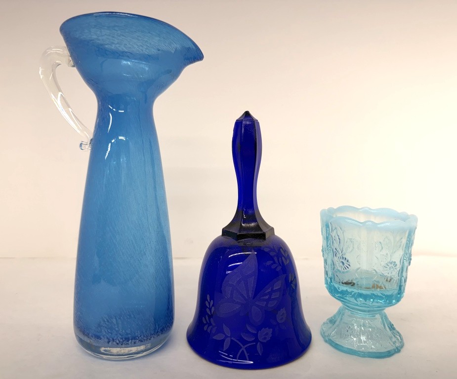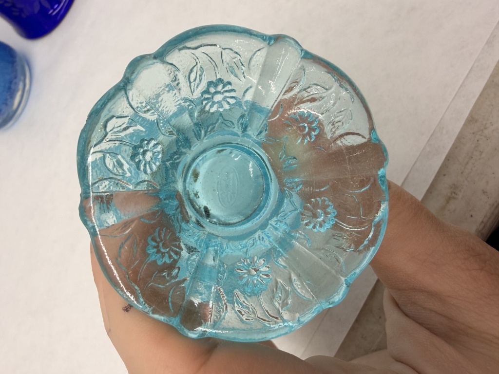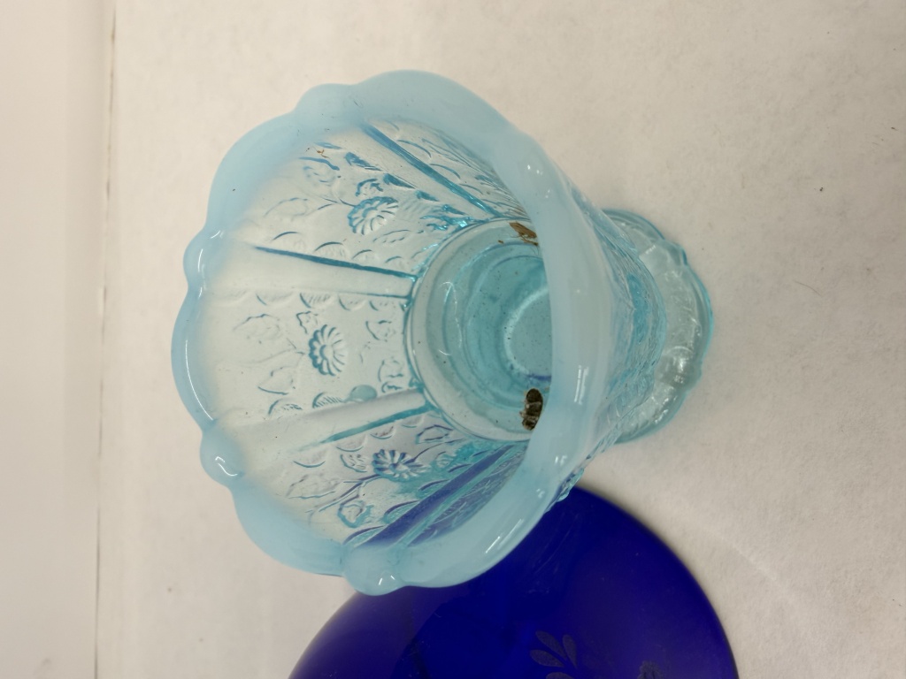 VINTAGE FENTON AQUA BLUE OPALESCENT GLASS PANELED DAISY TOOTPICK VOTIVE HOLDER AND 2 OTHER BLUE ART GLASS ITEMS