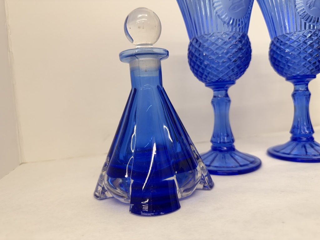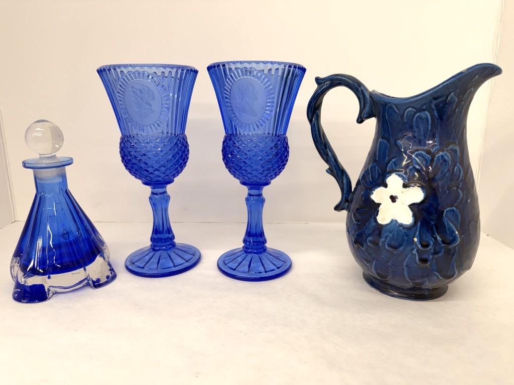 2 AVON GLASS GOBLETS, 1 POTTERY PITCHER, AND 1 CRISTALLO ART DECO BLUE COBALT CRYSTAL PERFUME BOTTLE