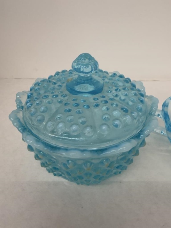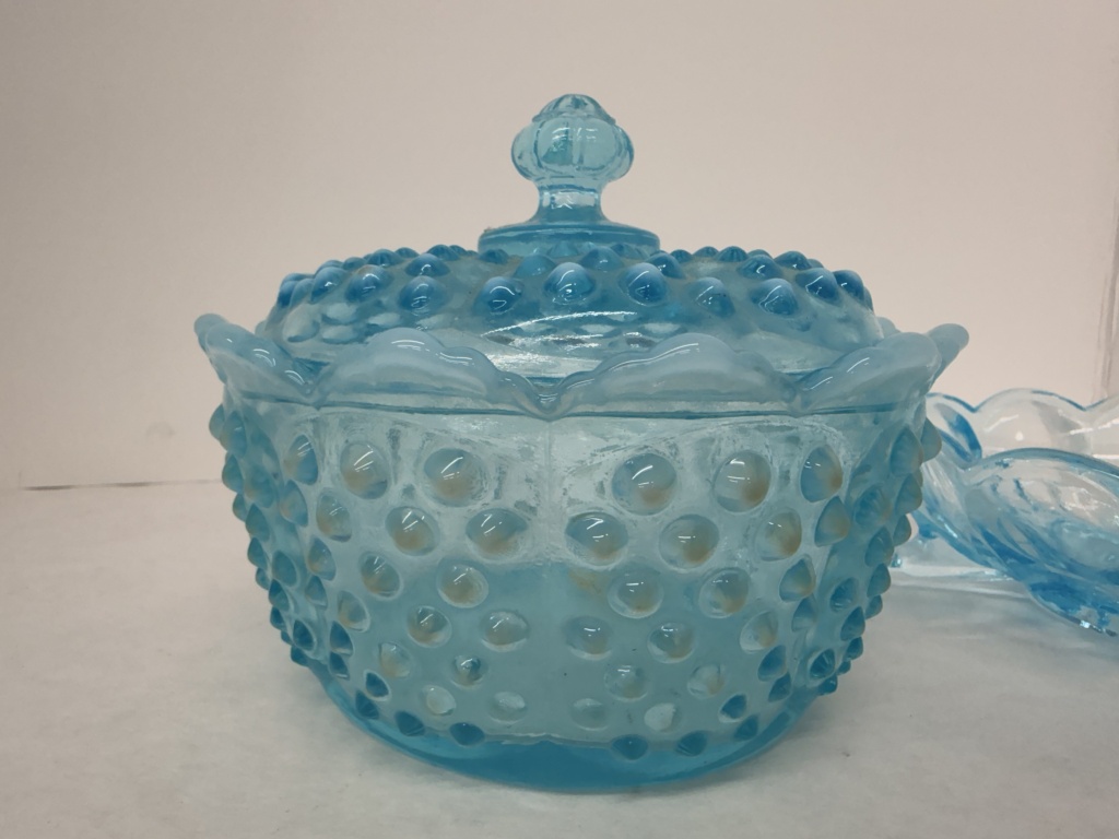 VINTAGE FENTON BLUE OPALESCENT HOBNAIL COVERED CANDY DISH