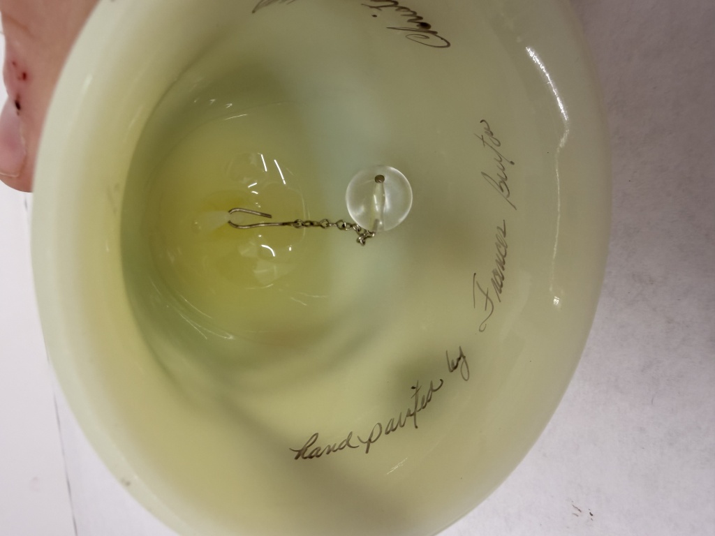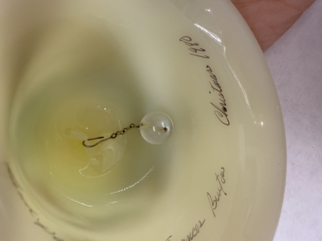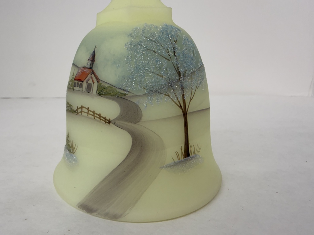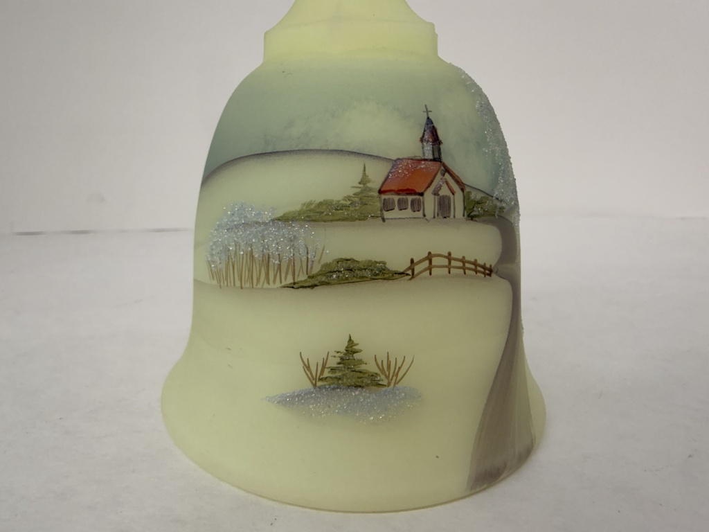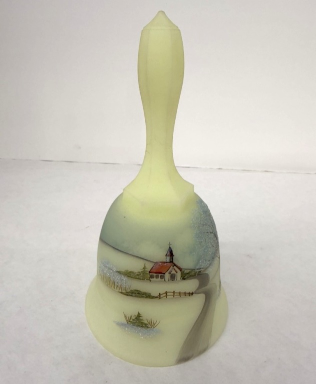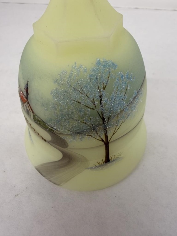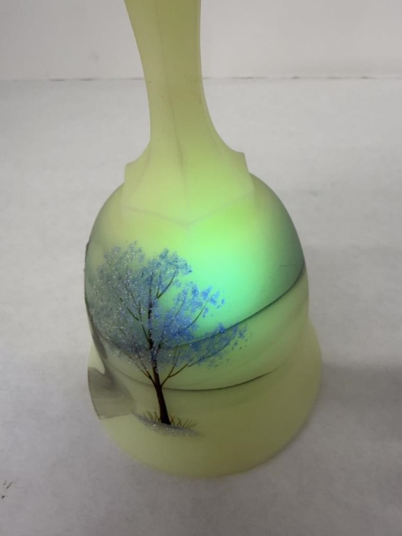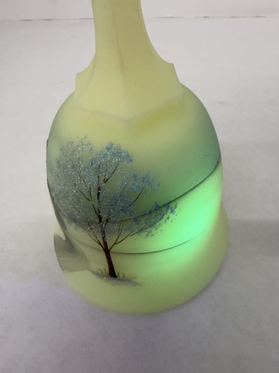 FENTON VASELINE CUSTARD GLASS BELL HAND PAINTED – TESTED AND GLOWS, SIGNED , WOODS SCENE
