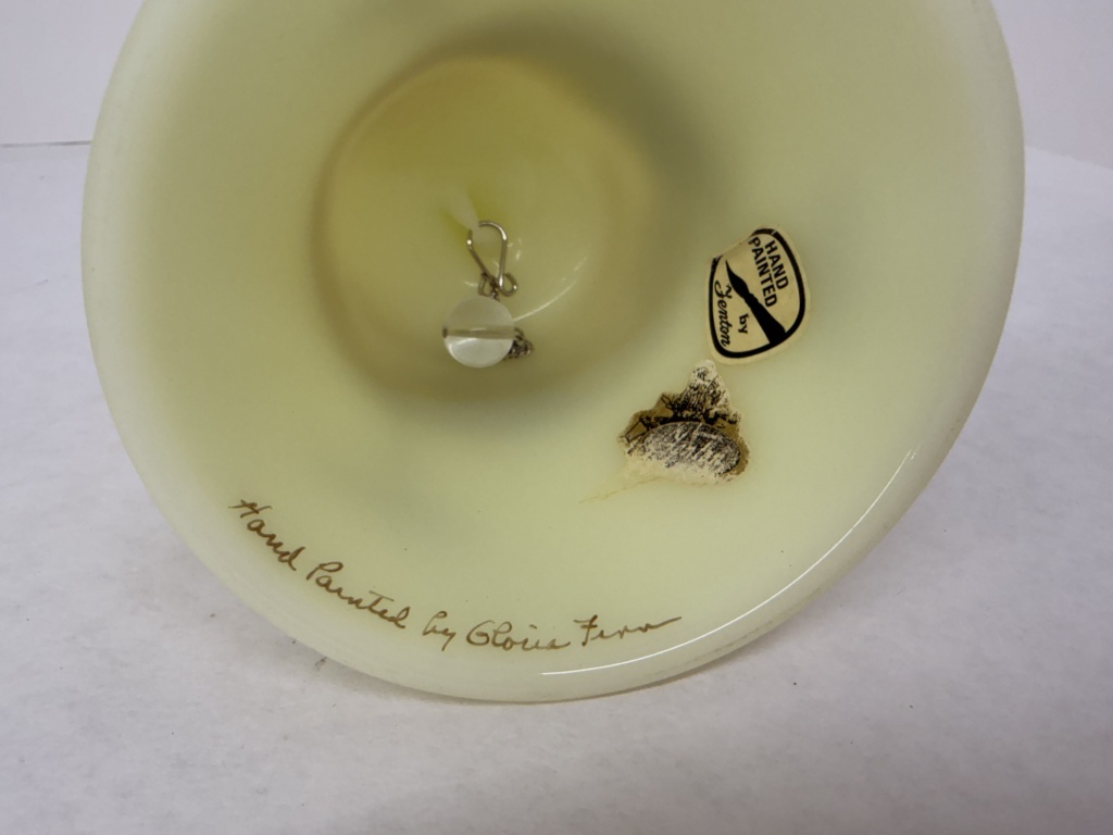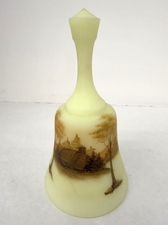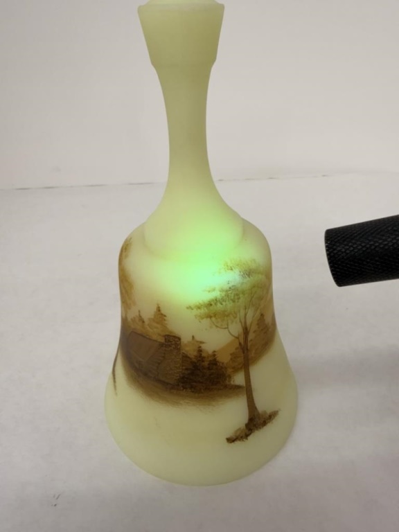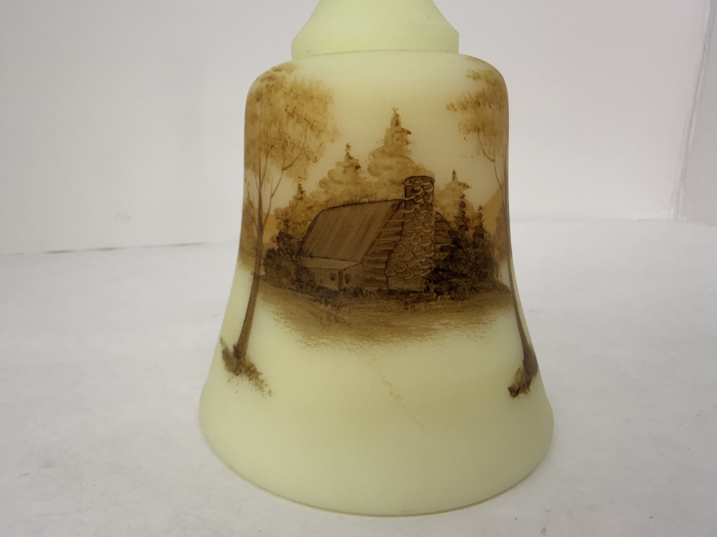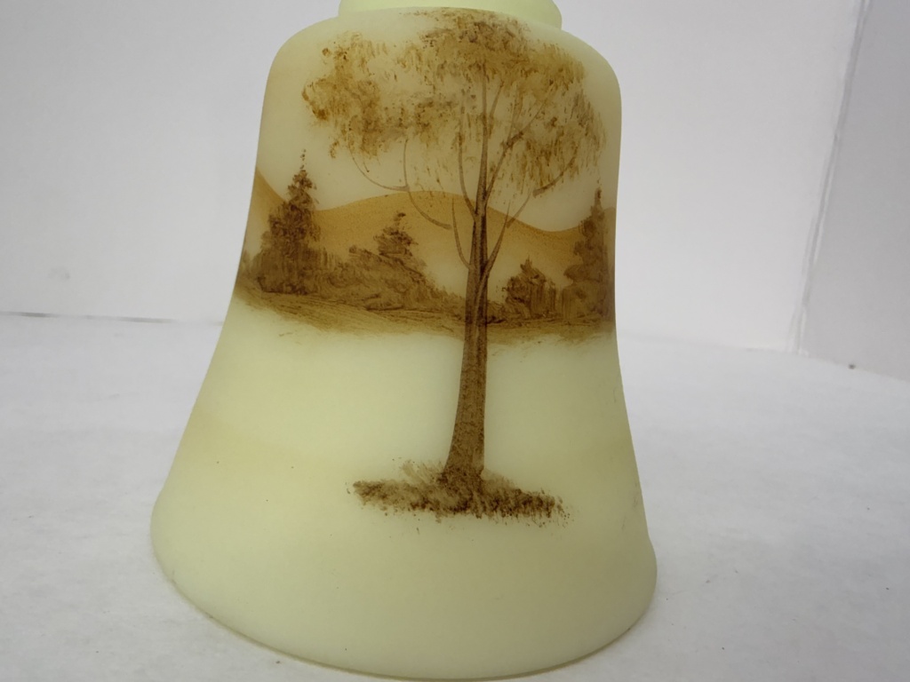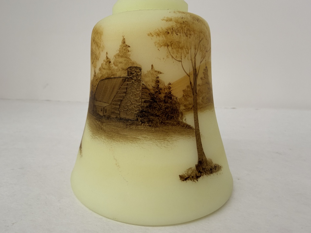 FENTON VASELINE CUSTARD GLASS BELL HAND PAINTED – TESTED AND GLOWS, SIGNED , WINTER SCENE