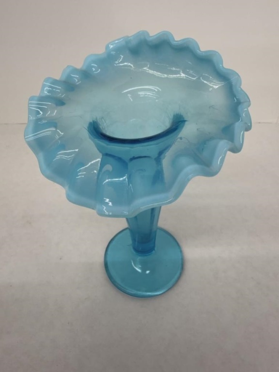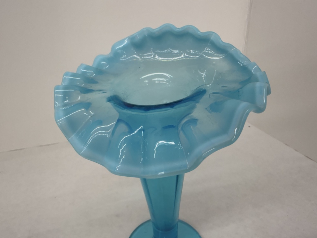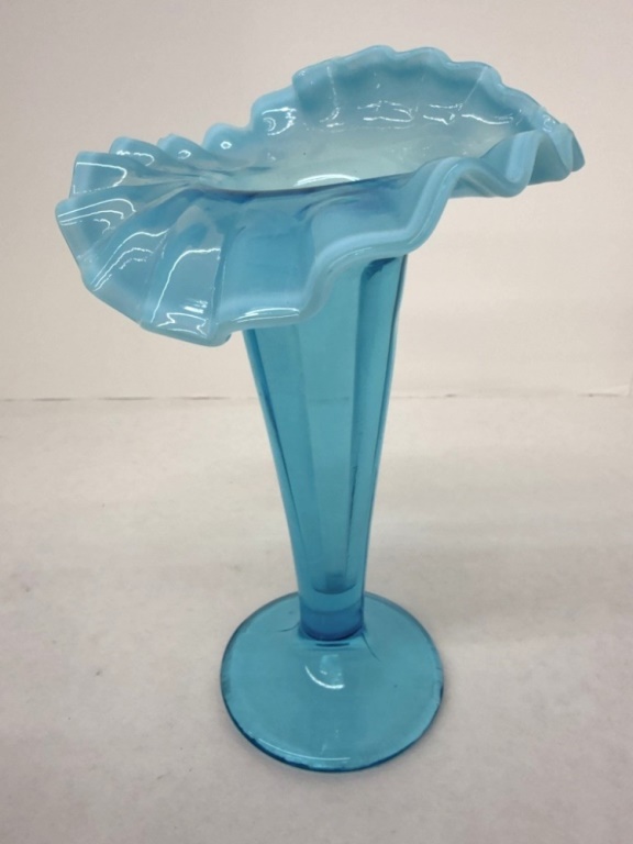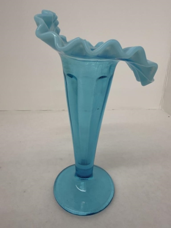 VINTAGE OPTIC RIBBED OPALESCENT BLUE SCALLOPED VASE