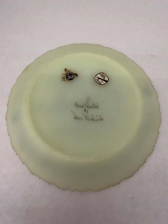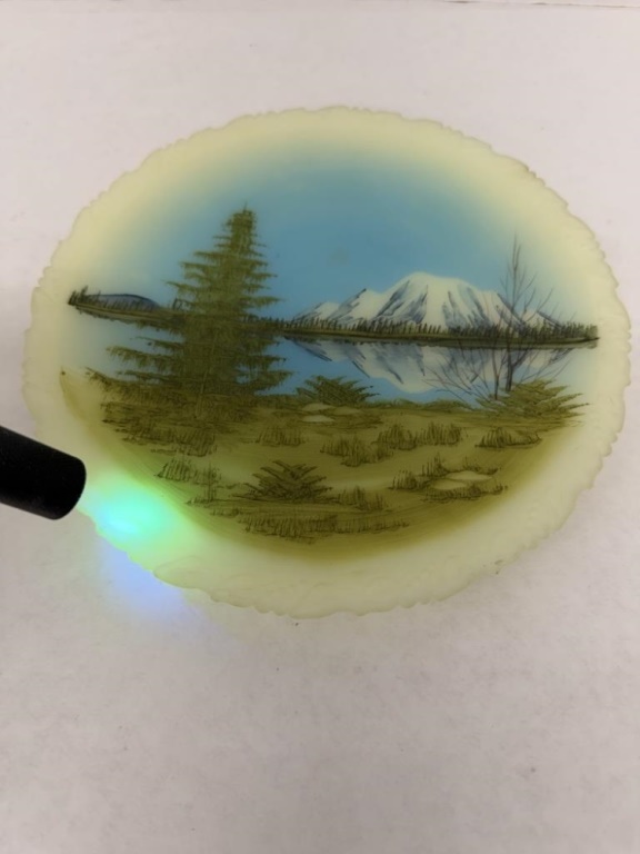 CUSTARD GLASS FARM SCENE PLATE, TESTED AND GLOWS, ARTIST SIGNED