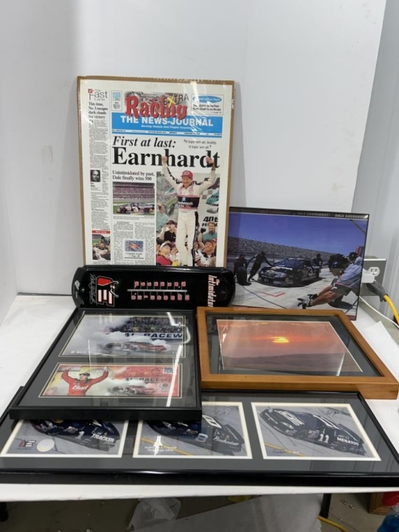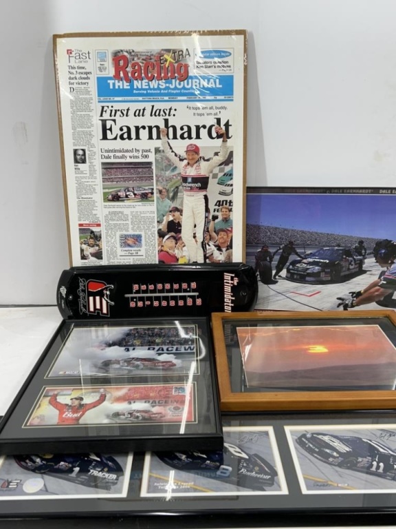 LOT OF DALE EARNHARDT MEMORABILIA INCLUDING A THERMOMETER AND PICTURES