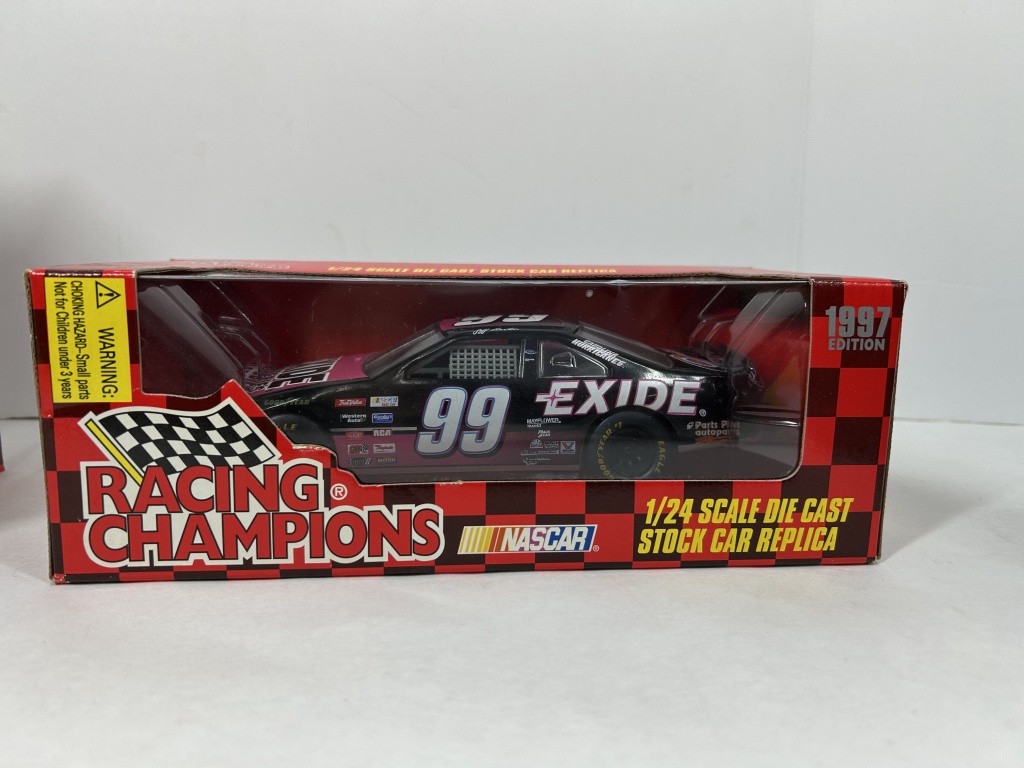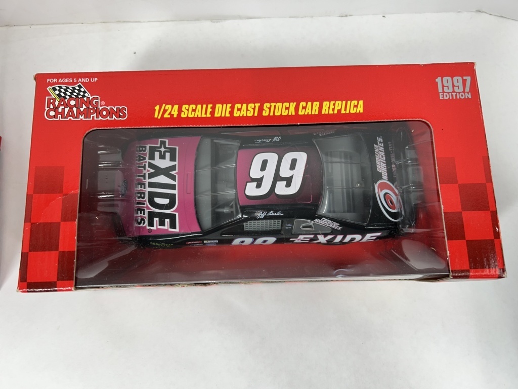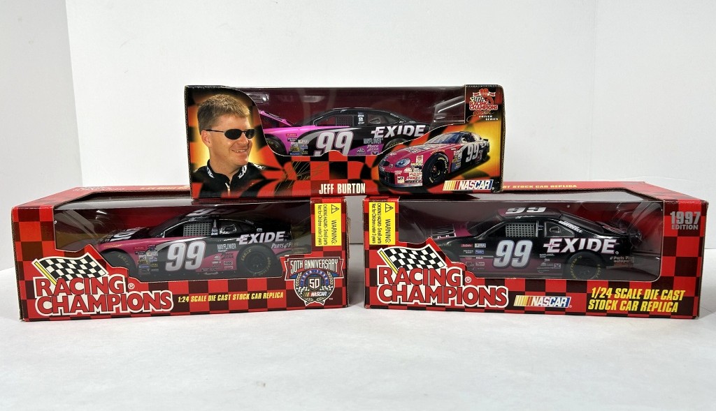NOS 1/24 RACING CHAMPIONS JEFF BURTON SIGNATURE DRIVER SERIES #99 DIECAST WITH OPENING HOOD AND REAL RUBBER TIRES SN:RN02, NOS 1/24 RACING CHAMPIONS 50TH ANNIVERSARY JEFF BURTON #99 DIECAST SN:H301, NOS 1/24 RACING CHAMPIONS 1997 JEFF BURTON DIECAST SN:C928