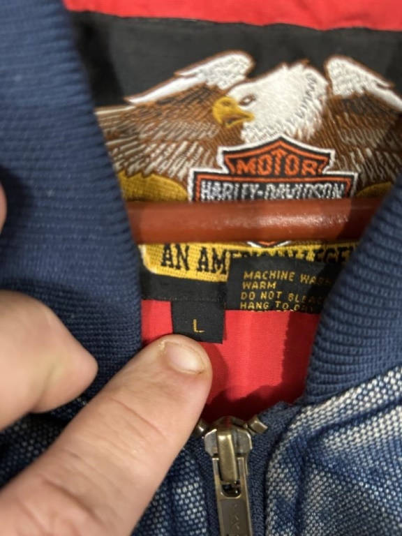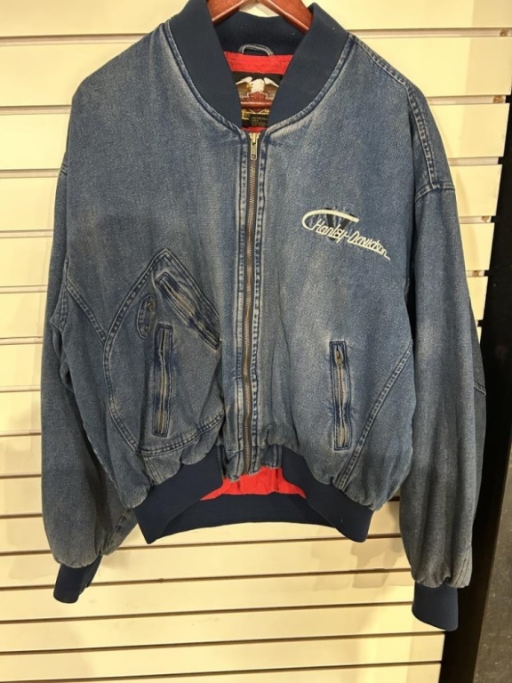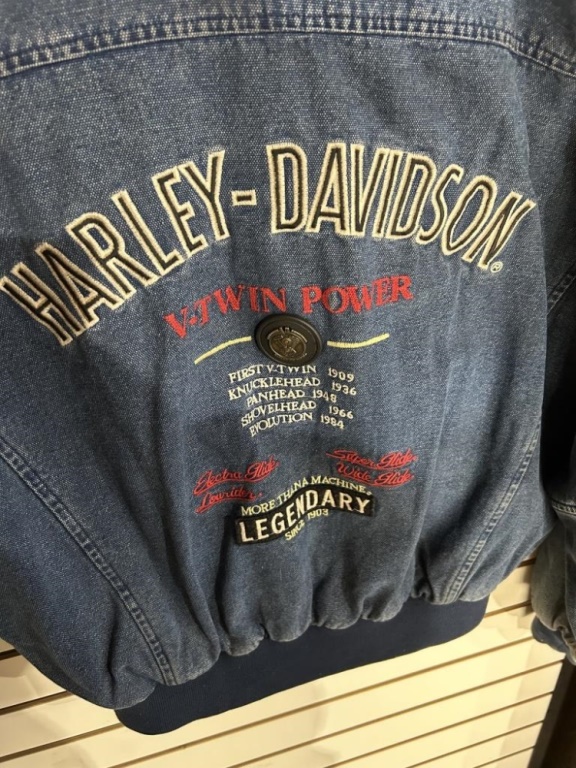 VINTAGE HARLEY DAVIDSON JACKET ( WITH A LIST OF ENGINE TYPES AND THE YEARS THEY WERE MADE ON THE BACK INCLUDING VTWIN ,PANHEAD,KNUCKLEHEAD,SHOVELHEAD,AND EVOLUTION)