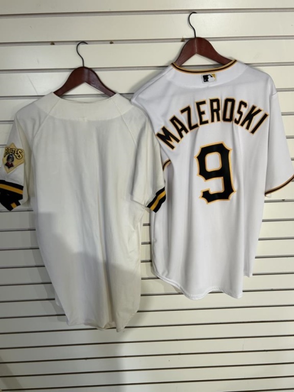 A PAIR OF VINTAGE PITTSBURGH PIRATES JERSEYS. ONE BILL MAZEROSKI JERSEY AND ONE WITH NO NAME