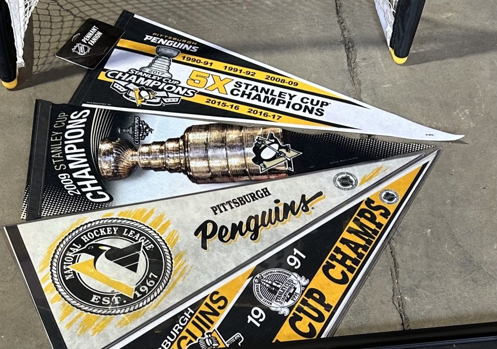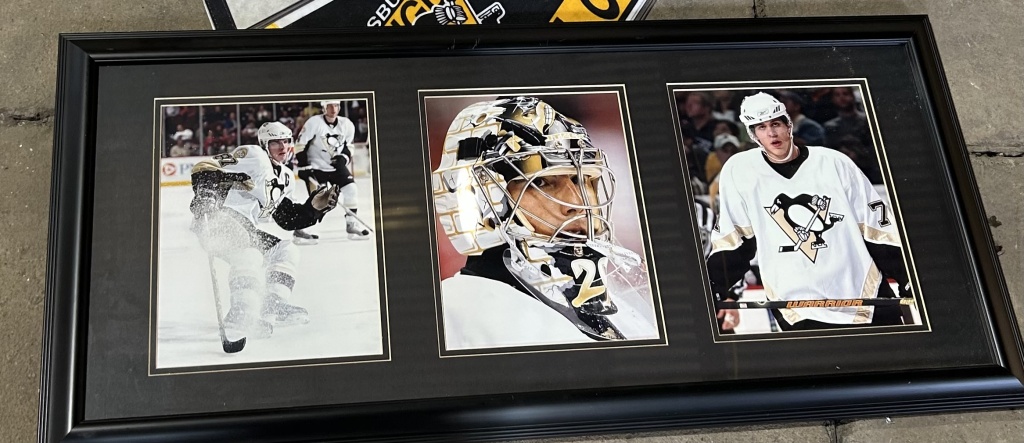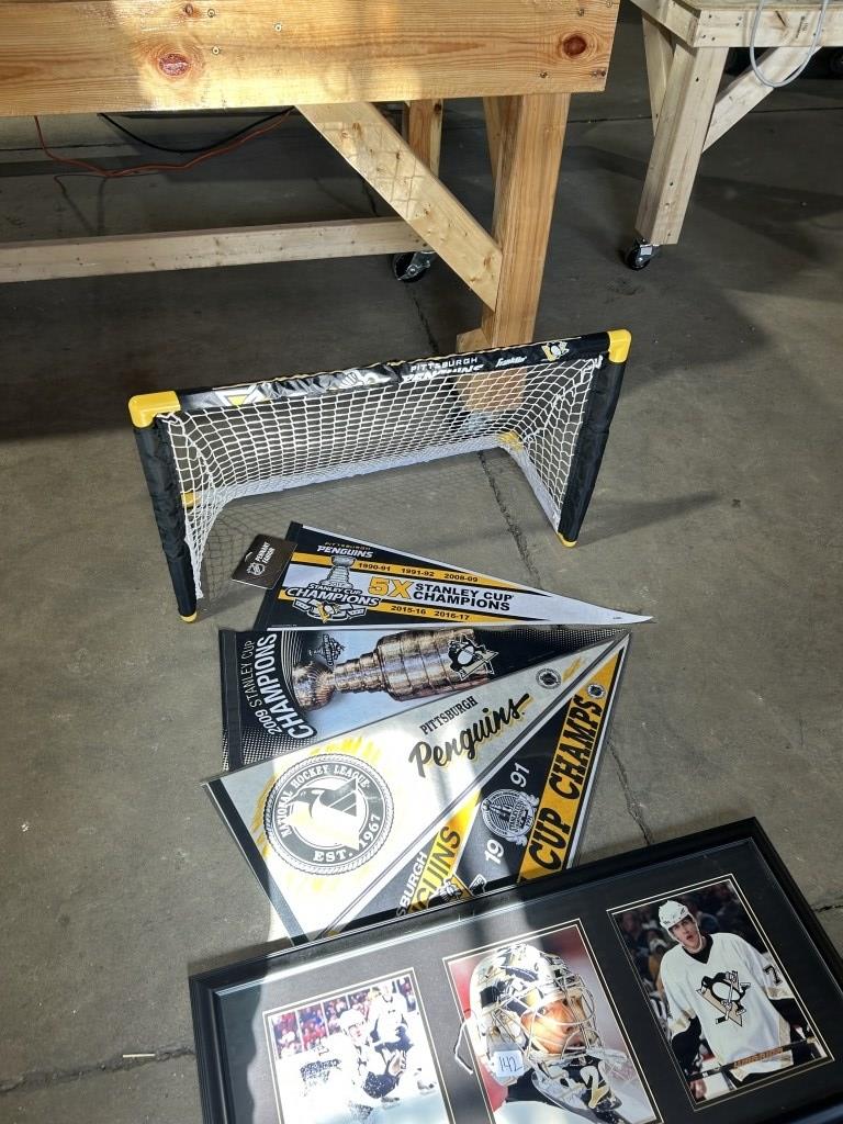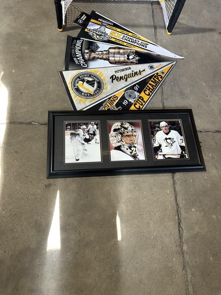 PENGUINS PHOTO OF CROSBY,MALKIN, AND FLEURY AS WELL AS PENGUINS PENNANTS AND A MINI HOCKEY GOAL